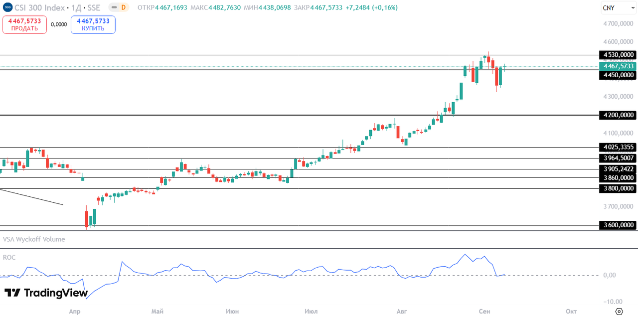 CSI 300 Индекс образовал бычий свечной паттерн, когда растущая свеча закрылась выше начала предыдущей свечи. При пробитии уровня 4530 пунктов и закрытия двух дней выше него возможно продолжение роста.