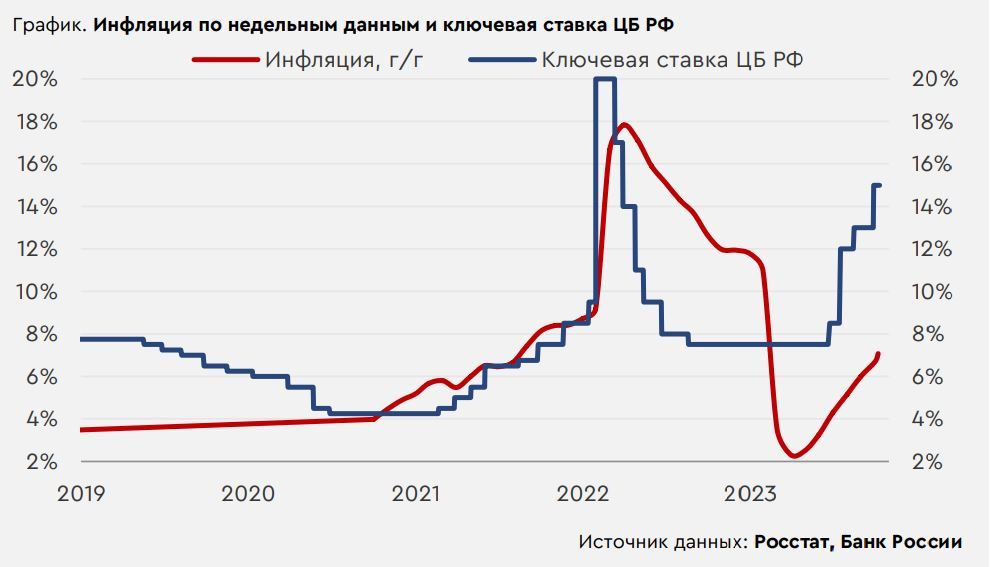 В центре внимания. На прошлой неделе на мировом рынке наблюдалась смешанная динамика. Высокому спросу на риск не способствовало некоторое ужесточение риторики представителей ФРС, а также ряд слабой экономической статистики из Китая. В России же прошлая неделя во многом отметилась снижением доходностей на долговом рынке. Тем не менее вышедшие вечером пятницы данные, указавшие на неожиданно сильный рост цен в РФ (см. развернутый комментарий), не располагают к дальнейшему существенному росту цен на ОФЗ. На глобальном рынке главным событием этой недели будет публикация октябрьской ценовой статистики в США, которая даст сигналы о дальнейших действиях ФРС. Инвесторы также будут отыгрывать данные по розничным продажам и промышленному производству в Китае и в США. В России в ближайшие дни в центре внимания останется динамика долгового рынка, на которую может повлиять публикация сезонноскорректированной статистики по октябрьской инфляции Банком России, а также традиционные аукционы по размещению ОФЗ и недельные данные по инфляции. Нефть и рубль. Нефтяные цены на прошлой неделе резко упали. Опасения относительно геополитической ситуации ослабились, и рынок сосредоточился на рисках более слабого спроса на нефть в мире. В частности, на такие перспективы указывала слабая статистика из Китая и резкий недельный рост запасов нефти в США. Сегодня фьючерсы Brent торгуются у $80,9/барр. Тем не менее в целом у нефтяных котировок остается потенциал к коррекционному росту в сторону $83/барр. На прошедшей неделе рубль умеренно укреплялся. При этом сильное падение нефтяных цен сейчас в моменте не оказывает выраженное влияние на внутренний валютный рынок. Сегодня курс USDRUB находится у 92,2 руб./$. Другие курсы валют EM с утра двигаются разнонаправленно. В целом на этой неделе курс USDRUB может продолжить двигаться в диапазоне 91,25-93,25 руб./$. Ценовая статистика в России. Вечером пятницы Росстат опубликовал октябрьскую ценовую статистику, которая указала на ускорение инфляции до 6,7% г/г и мало чем удивила инвесторов. Намного более значимыми были недельные данные по инфляции, неожиданно указавшие на ускорение роста цен в стране с 0,14% н/н сразу до 0,42% н/н, максимума с начала декабря, когда проводилась индексация тарифов ЖКХ. В годовом выражении инфляция ускорилась уже до 7% г/г, достигнув нижней границы прогнозного диапазона ЦБ РФ в 7-7,5% г/г по итогам 2023 года. Усиление ценового давления в первую очередь объясняется разовым повышением цен на отечественные автомобили, на которое пришлось около половины прироста ИПЦ. Более высокие цифры по недельной инфляции так же могут быть связаны с тем, что из-за праздников данные фиксировались за 8 дней вместо традиционных 7. В дальнейшем недельная инфляция должна замедлиться, но риски повышения ключевой ставки до 16% годовых в декабре остаются значимыми.