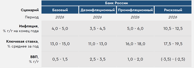 Глобальный рынок в понедельник показывал восходящую динамику. Поддержку рисковым активам оказывали позитивные новости о ходе торговых переговоров. Инвесторы теперь ждут встречи президентов США и Китая. Российский рынок вчера заметно падал по мере того, как игроки на торговых площадках продолжали отыгрывать санкционные новости и переосмыслять итоги заседания Банка России. При этом вчера ЦБ опубликовал параметры своих альтернативных прогнозных сценариев, многие из которых предполагают еще более высокую траекторию «ключа», чем показывал базовый прогноз с пятничного заседания. Инвесторы в мире сегодня будут отыгрывать ряд публикуемой статистики, в частности по американскому рынку недвижимости и по инфляционным ожиданиям европейцев. В центре внимания также останутся и новости сезона отчетностей. В России на сегодня не запланировано значимых локальных событий. Вторник отметится лишь анонсом параметром завтрашних аукционов по размещению ОФЗ. Нефть и рубль Вчера цены на нефть умеренно снизились. Давление на котировки могли оказывать сообщения о возможном дальнейшем наращивании добычи ОПЕК+ в декабре. Впрочем, геополитические новости и ослабившийся доллар компенсировали для нефти негатив от данных сообщений. Сегодня фьючерсы Brent торгуются у $65,5/барр. Пока котировки могут двигаться вблизи $65-66/барр., а дальнейшую динамику им зададут вечерние цифры API по динамике запасов в США. Рубль в понедельник заметно укреплялся, но после завершения рабочего дня российская валюта развернулась. В итоге рубль на МосБирже незначительно ослабился по итогам дня. Такая динамика может отражать выросшие продажи валюты юрлицами – как в рамках налогового периода, так и в рамках перевода иностранной валюты во внутренний контур до окончательного вступления в силу последних ограничений. Сегодня курс CNYRUB находится у 11,18 руб./юань. Другие валюты EM с утра двигаются разнонаправленно. Сегодня налоговый период окончательно завершится, что будет располагать к постепенному росту курса в сторону 11,30 руб./юань. Альтернативные прогнозы Банка России Вчера ЦБ в Основных направлениях единой государственной денежно- кредитной политики выпустил итоговые параметры альтернативных прогнозов. В дезинфляционном сценарии (средняя ставка 11-13% в 2026) предполагается заметное расширение предложения на фоне осуществленных ранее инвестиций. В результате происходит, казалось бы, парадоксальное сочетание высоких темпов экономического роста с инфляцией ниже «таргета» (см. таблицу). В проинфляционном сценарии (средняя ставка 16-18% в 2026), наоборот, предложение из-за ужесточения санкций будет более низким, чем в базовом сценарии. В итоге с учетом также и более сильного спроса инфляция замедлится лишь до 5-6% г/г в грядущем году. Наконец, рисковый сценарий предполагает начало мирового финансового кризиса, что потребует от ЦБ ужесточения ДКП (средняя ставка 17,5-19,5% в 2026). Публикация таких прогнозов дополнительно ухудшила настроения у инвесторов, учитывая также, что параметры проинфляционного сценария для рынка могут выглядеть крайне вероятными. Сравнение отдельных параметров альтернативных прогнозов ЦБ РФ