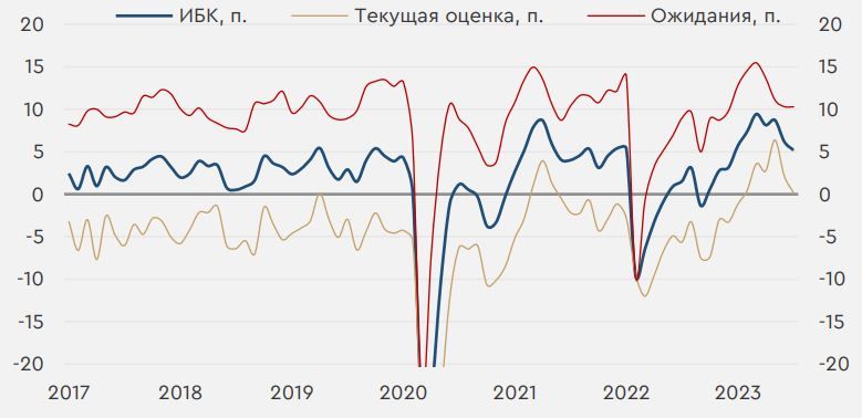 Индикатор бизнес-климата в России. Опубликованные в пятницу данные указали на снижение индикатора[1]бизнеса климата ЦБ РФ в августе на 1 п. до 5,2 п., минимума с начала года, что сигнализирует об охлаждении после резкого роста экономики в первой половине года. В первую очередь снижение показателя связано с ухудшением оценок текущей ситуации, в то время как ожидания бизнеса остались в целом на прежних уровнях. Пятничная статистика указала также на рост ценовых ожиданий предприятий сразу на 5,2 п.п. до 22,6%. На фоне слабевшего рубля показатель обновил максимум с мая прошлого года, что отчасти объясняет последние действия ЦБ РФ.