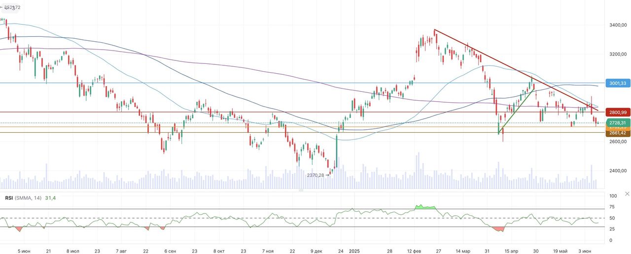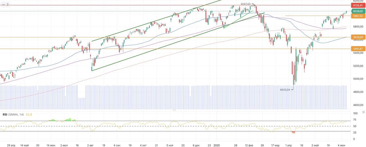 В среду, 11 июня, на мировых рынках преобладает оптимизм на фоне прогресса в торговых переговорах между США и Китаем. В США вчерашняя торговая сессия завершилась в плюсе. Индекс S&P 500 вырос на 0,55% — до 6038,81 пункта, Dow Jones Industrial Average прибавил 0,25% — до 42 866,87 пункта, а Nasdaq Composite поднялся на 0,63%, завершив день на отметке 19 714,99 пункта. Инвесторы ожидают дополнительных деталей по итогам переговоров между США и Китаем. Министр торговли США Говард Латник накануне сообщил, что стороны согласовали план реализации договоренностей о частичном снятии торговых ограничений и обеспечении поставок редкоземельных металлов из КНР. Теперь рамочные соглашения должны получить одобрение лидеров двух стран. Сегодня инвесторы также ждут публикации данных по потребительской инфляции в США за май. Если статистика подтвердит замедление роста цен, у ФРС появится больше оснований для снижения ключевой ставки. Акции Alphabet выросли на 1,3% на фоне новостей о том, что облачное подразделение Google заключило соглашение с OpenAI о предоставлении вычислительных мощностей для обучения ИИ-моделей. Азиатские рынки также демонстрировали рост. Японский индекс TOPIX прибавил 0,1%, южнокорейский Kospi — 1,2%, китайский CSI 300 — 0,7%, а гонконгский Hang Seng вырос на 0,8%. Китайские акции отреагировали ростом на позитивные сигналы из Лондона, где проходили американо-китайские переговоры. Особенно сильный рост показали бумаги автопроизводителей: BYD (+3,2%), Nio (+3,5%), Xpeng (+1,5%). В технологическом секторе также наблюдались активные покупки: Xiaomi прибавила 2,3%, JD.com — 2,1%. Европейские рынки открылись в положительной зоне: индекс STOXX 600 вырос на 0,12%. Отчетность испанского ритейлера Inditex разочаровала инвесторов. Выручка владельца сети Zara оказалась ниже ожиданий аналитиков на фоне замедления темпов роста продаж, вызванного тарифной неопределенностью. Компания также сообщила о снижении темпов роста продаж в начале лета до 6% (г/г) по сравнению с 12% (г/г) годом ранее. Акции Inditex подешевели на 4,6%. Инвесторам, интересующимся глобальным рынком акций, рекомендуем стратегию Global. И целого мира мало. Российский рынок сегодня пытается восстановиться после недавней коррекции. Утром Индекс МосБиржи вырос на 0,31%, достигнув отметки 2730,80 пункта. Лучше рынка выглядят акции «Аэрофлота», прибавившие 1,2%. Поддержку котировкам оказывает новостной фон: в последние два дня представители России активно заявляют о намерении начать переговоры с США по поводу восстановления прямого авиасообщения между странами. Акции ГК «МД Медикал», управляющей сетью клиник «Мать и дитя», также демонстрируют рост — +1,0%. Компания ожидает увеличения выручки по итогам 2025 года на 28%. Положительное влияние на финансовые показатели может оказать интеграция сети клиник ГК «Эксперт», приобретенной в конце мая. Технический анализ Индекс МосБиржи Российский бенчмарк пытается реализовать локальный отскок после заметной коррекции. Ближайшей целью для роста выступает уровень сопротивления в районе 2800 пунктов.