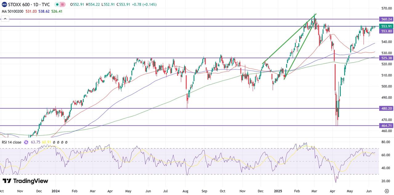 STOXX 600 Европейский индекс вновь тестирует сильный уровень сопротивления в районе 554 пунктов. В случае пробоя откроется потенциал роста до 560 пунктов.