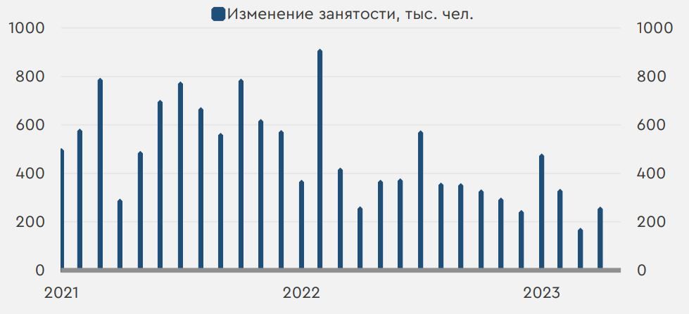 В центре внимания. В последние дни спрос на рисковые активы в мире остается слабо выраженным. ФРС, как и ожидалось, повысила ставку на 25 б.п. и не предоставила рынку направленных сигналов о дальнейших действиях. При этом в моменте риски потери стабильности финансового сектора дополнительно усиливались на фоне падения акций отдельных банков США, а пятничная трудовая статистика пока не располагает к смягчению риторики ФРС (см. развернутый комментарий). В России прошлая неделя во многом отметилась укреплением рубля до уровней конца марта. Главное событие текущей недели состоится сегодня – в США будет опубликована апрельская ценовая статистка. Консенсус-прогноз предполагает сохранение прежних темпов роста цен в годовом выражении. Если же инфляция ускорится впервые практически за год, на мировом рынке могут заметно усилиться risk-off настроения. В России на этой неделе в центре внимания останется динамика рубля, но инвесторы будут следить и за апрельской бюджетной статистикой, которая может напомнить о рисках усиления ценового давления. Нефть и рубль. На прошлой неделе цены на нефть заметно снижались в связи с усилившимися опасениями более слабого спроса на нефть. Впрочем, с пятницы котировки перешли к коррекционному росту, и сегодня фьючерсы Brent торгуются у $76,9/барр. Помимо данных по инфляции в США, на динамику котировок в ближайшие дни повлияет публикация месячного отчета ОПЕК по рынку нефти. Если прогнозы по росту спроса на нефть будут заметно снижены, фьючерсы Brent могут вновь опуститься ниже $75/барр. Рубль на прошедшей неделе заметно укреплялся. Помимо фактора восстановительного роста торгового профицита РФ, поддержку рублю в моменте мог оказывать низкий спрос на валюту на короткой неделе, продажа валюты экспортерами для подготовки к выплате дивидендов и анонс дальнейших продаж юаней по бюджетному правилу против ожидания начала их покупок. Сегодня курс USDRUB находится у 77,1 руб./$. Другие курсы валют EM с утра двигаются разнонаправленно. В целом на этой короткой неделе потенциал ослабления рубля может быть ограниченным в отсутствии особо негативных санкционных новостей. Статистика по рынку труда. США В пятницу была опубликована апрельская трудовая статистика, не указавшая на существенное ухудшение ситуации на американском рынке труда. Рост числа занятых ускорился со 165 тыс. человек до 253 тыс. в апреле (прогноз 180 тыс.), что, впрочем, компенсируется пересмотром вниз данных по росту занятости в прошлом месяце. С другой стороны, на фоне сокращения рабочей силы уровень безработицы снизился на 0,1 п.п. до 3,4%, вернувшись к минимумам с 1969 года. При этом пятничная статистика указала также на ускорение роста зарплат с 0,3% м/м до 0,5% м/м (прогноз 0,3% м/м), максимумов более чем за год. Такие данные пока не располагают к смягчению позиции ФРС, но сильное состояние рынка труда снижает риски рецессии в глазах инвесторов, учитывая рыночные ожидания окончания цикла ужесточения ДКП в США. Изменение числа занятых в несельскохозяйственном секторе США