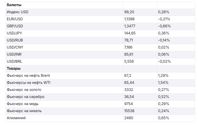 В начале этой недели индекс доллара консолидируется в районе 99,0. Инвесторы заняли выжидательную позицию, чтобы посмотреть на итоги переговоров США и Китая по торговле. Подробностей пока нет, но любой прогресс в переговорах может принести позитив на фондовые рынки и добавит сил доллару. Курс евро на этом фоне продолжает торговлю в районе 1,14, то есть вблизи от своих годовых максимумов. Британский фунт этим утром теряет 0,6% к доллару и пара GBP/USD снизилась до 1,347. Курс японской иены во вторник находится примерно на уровне понедельника – район 144,62. Инвесторы продолжают следить за торговыми переговорами между США и Китая. Вчера в Лондоне встретились американские и китайские переговорщики, чтобы развить предварительное соглашение, достигнутое в прошлом месяце в Женеве после недавнего телефонного разговора между президентом США Дональдом Трампом и главой КНР Си Цзиньпином.