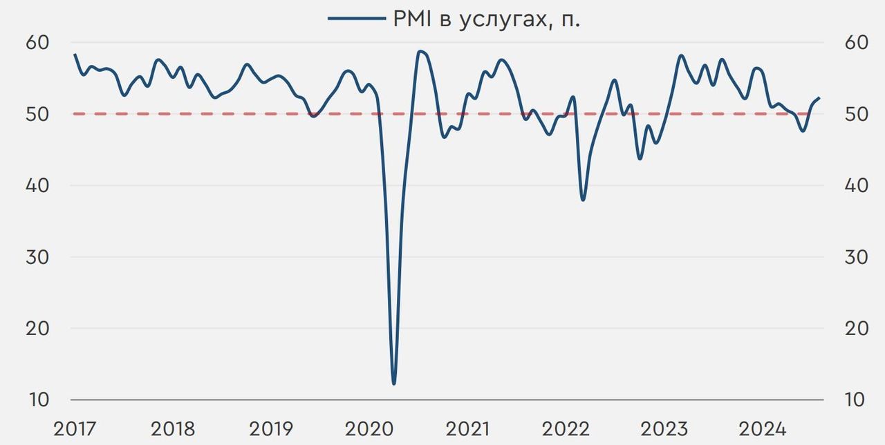 На мировом рынке во вторник прошла волна risk-off. У инвесторов вновь усилились опасения рецессии на фоне слабой отчетности ряда компаний и в ожидании пятничной публикации августовских данных по рынку труда США. На рынке РФ вчера была высокая волатильность, по итогам дня индекс МосБиржи все же снизился вслед за глобальными площадками. В то же время вечером ЦБ опубликовал бюллетень «О чем говорят тренды», в котором регулятор подчеркнул замедление экономического роста и наметившиеся дезинфляционные тренды. На этом фоне российский рынок может снова предпринять попытку к росту в ожидании сохранения прежней ключевой ставки в сентябре, хоть и риски ужесточения ДКП в октябре сохраняются. В среду инвесторы в мире будут оценивать июльские данные по числу открытых в США вакансий, которые позволят лучше оценить, насколько сильно усугубилась ситуация на рынке труда. Рынок внимание также может обратить на данные по индексу цен производителей в еврозоне, важные для дальнейших решений ЕЦБ по ставке и для евро. В РФ сегодняшний день отметится публикацией традиционных недельных цифр по инфляции и аукционами по размещению ОФЗ, на которых Минфин предложит ОФЗ-ПК 29025 и ОФЗ-ПД 26245. При этом утром уже вышли данные, показавшие рост индекса PMI в сфере услуг России до максимума с января (см. развернутый комментарий). Нефть и рубль Цены на нефть вчера резко упали. Рынок все более явно видит риски ослабления спроса на сырье, особенно со стороны Китая. Сегодня фьючерсы Brent торгуются у $72,7/барр. Тем не менее у котировок остается потенциал к коррекционному росту, если вечерние данные от API сегодня укажут на заметное снижение запасов за неделю. Во вторник рубль ослабился против юаня, но смог заметно укрепиться к доллару и евро. Пока на валютном рынке РФ наблюдается волатильная и разнонаправленная динамика. Сегодня курс CNYRUB находится у 12,31 руб./юань. Другие курсы валют EM с утра двигаются разнонаправленно. Сегодня Минфин раскроет сентябрьские объемы покупок валюты по бюджетному правилу. В случае их существенного роста и, соответственно, снижения чистых продаж юаней Банком России, рост курса CNYRUB в сторону 12,5 руб./юань может ускориться. Индекс деловой активности в сфере услуг России Сегодняшняя статистика за август показала рост индекса PMI в российской сфере услуг с 51,1 п. до 52,3 п. В результате показатель обновил максимум с января, а составной индекс деловой активности вырос на 0,2 п. до 52,1 п. даже в условиях снижения PMI в производстве. Составляющие индекса по сфере услуг указали на усилившийся в августе спрос – темпы роста новых заказов были максимальными с марта. Впрочем, одновременно респонденты отметили замедление роста издержек до минимума с мая и минимальные с апреля темпы увеличения отпускных цен. В целом августовские оперативные данные повышают вероятность «паузы» на заседании ЦБ 13 сентября, но с сохраняющимися перспективами ужесточения ДКП в октябре. Индекс деловой активности в сфере услуг РФ