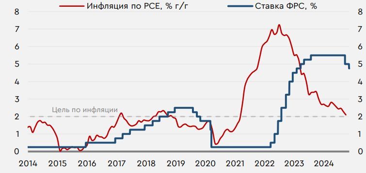 На прошлой неделе в мире были повышенные уровни волатильности. Рисковые активы по-разному реагировали на победу республиканцев на выборах в США. Американские фондовые индексы заметно выросли, но в связи с рядом проинфляционных рисков от инициатив новой администрации наблюдалось существенное укрепление доллара и рост доходностей казначейских бумаг США. Впрочем, ФРС на своем заседании, как и ожидалось, снизила ставку на 25 б.п. до 4,75% годовых по верхней границе. Рынок РФ показывал выраженную позитивную динамику, отыгрывая новости из США. Данные, показавшие возврат федерального бюджета к дефициту в октябре, не оказали выраженное влияние на динамику российских активов. Статистика, которая указала на замедление недельной инфляции с 0,27% н/н до 0,19% н/н за 8 дней по 5 ноября, вышла вечером пятницы, и рынок отыгрывать ее будет лишь сегодня. В ближайшие дни фокус инвесторов сместится на октябрьскую ценовую статистику в США, способную прояснить дальнейшую траекторию ставки ФРС. Рынок также обратит внимание на данные по промышленному производству и розничным продажам в Китае и в США, которые будут важными для цен на сырье. Российский рынок также будет оценивать экономическую статистику. В частности, на этой неделе Росстат опубликует первую оценку ВВП в третьем квартале и полные месячные данные по инфляции. Если они вновь значимо превысят недельные оценки, доходности ОФЗ вернутся к росту. Нефть и рубль На прошлой неделе цены на нефть смогли умеренно вырасти. К более выраженному росту не располагало укрепление доллара после выборов в США и данные, показавшие более сильный, чем ожидалось, рост нефтяных и бензиновых запасов в США. Сегодня фьючерсы Brent торгуются у $73,9/барр. Помимо экономической статистики из Китая и США, на динамику котировок повлияют месячные отчет ОПЕК и МЭА. В целом у Brent есть потенциал к повторному росту в сторону $75/барр. Рубль по итогам недели укрепился к юаню и евро, но ослабился к доллару на фоне глобального роста индекса DXY. Стоит также отметить заметно улучшившуюся ситуацию с юаневой ликвидностью внутри РФ. Сегодня курс CNYRUB находится у 13,58 руб./юань. Другие курсы валют EM с утра двигаются разнонаправленно. В сформировавшихся условиях курс может попробовать задержаться ниже 13,60 руб./юань. Заседание ФРС После снижения сразу на полпроцента в сентябре, ставка ФРС в этот четверг была снижена скромнее – на 25 б.п. до 4,75% годовых по верхней границе. Такое решение в целом не удивило рынок. Регулятор при этом подчеркнул, что последние очень слабые данные по рынку труда, действительно, могут объясняться временными факторами. Сигналы ФРС были не столь мягкими, как в сентябре. В частности, глава регулятора отметил готовность замедлить процесс смягчения ДКП, если инфляция не будет показывать признаков замедления к целевым уровням. Тем не менее фьючерсный рынок пока наиболее вероятным сценарием (65%) видит еще одно снижение ставки на 25 б.п. в этом году. Ставка ФРС по верхней границе и динамика ценового индекса PCE в США