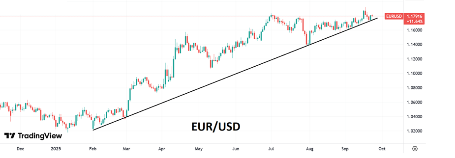 В понедельник индекс доллара немного скорректировался после трех дней активного роста в конце прошлой недели. Это не изменило общую техническую картину рынка: этим утром DXY торгуется в районе 97,3 – это средний уровень прошлой недели. Курс евро также прекратил ослабление, получив поддержку на линии среднесрочного растущего тренда и во вторник находится возле 1,18 к доллару. Британский фунт вчера и сегодня утром немного восстановил свои позиции: GBP/USD 1,352. Спокойная торговля продолжается по японской иене, курс которой к доллару остается в рамках 146,5-148,5. В Японии сегодня выходной и биржи закрыты. Третью сессию подряд китайский юань никуда не уходит от отметки 7,112 к доллару. В начале этой недели индекс доллара немного снизился после трех сессий роста. Сейчас трейдеры оценивают вероятность сохранения процентной ставки на октябрьском заседании ФРС на прежнем уровне примерно в 8%, против 15% неделей ранее. На сентябрьском заседании председатель ФРС Дж. Пауэлл подчеркнул, что решение о снижении ставки по федеральным фондам на 0,25% не знаменует собой начало нового цикла смягчения денежно-кредитной политики. В настоящее время рынки закладываются на еще два снижения ставки на 25 б.п. на оставшихся заседаниях ФРС в этом году и эти ожидания устойчивого смягчения денежно-кредитной политики подпитывают рост цен на золото и серебро в сентябре. На прошлой и в начале этой недели цена на золото почти непрерывно переписывает свои рекордные максимумы. Этим утром мы видим золото на $3755/унц – новый исторический рекорд. Ускорение роста цен без особых на то причин – признак приближения коррекции, но в какой точке это случится сказать сложно. Пока нет новостных поводов, чтобы мировой валютный рынок вышел на новые ценовые уровни. Возможно, свет на перспективы ДКП в США прольют выступления нескольких представителей ФРС, которые мы должны услышать на этой неделе. Президент ФРБ Сент-Луиса Альберто Мусалем отметил, что ставки в настоящее время находятся «между умеренно ограничительными и нейтральными», и предупредил, что возможности для дальнейшего снижения ставок без перехода к чрезмерной либерализации ограничены. Президент ФРБ Атланты Рафаэль Бостик накануне заявил, что необходимо сосредоточиться на обеспечении возвращения инфляции к целевому уровню ФРС в 2%, и что дальнейшее снижение ставок в этом году не требуется. В свою очередь президент ФРБ Кливленда Бет Хэммак также заявила, что ФРС «должна быть очень осторожной в снятии ограничений денежно-кредитной политики». Однако ни Бостик, ни Хэммак не голосуют в FOMC в этом году. Также в конце недели ожидается традиционная публикация данных по ценовому индексу потребительских расходов (PCE) – они очень важны для ФедРезерва в части оценки инфляционных рисков. Начиная с 18 сентября доходность по 10-летних казначейским облигациям США растет. Ко вторнику она восстановилась до 4,14% - это трехнедельный максимум. Данный фактор удерживает курс доллара от снижения. Индекс национальной активности ФРБ Чикаго (CFNAI) для США в августе 2025 года составил -0,12, что является самым высоким показателем за 5 месяцев, по сравнению с -0,28 в августе. Динамика этого индекса предполагает ускорение экономического роста в августе. Опубликованный накануне индекс потребительских настроений в еврозоне в сентябре вырос до -14,9 по сравнению с -15,5 