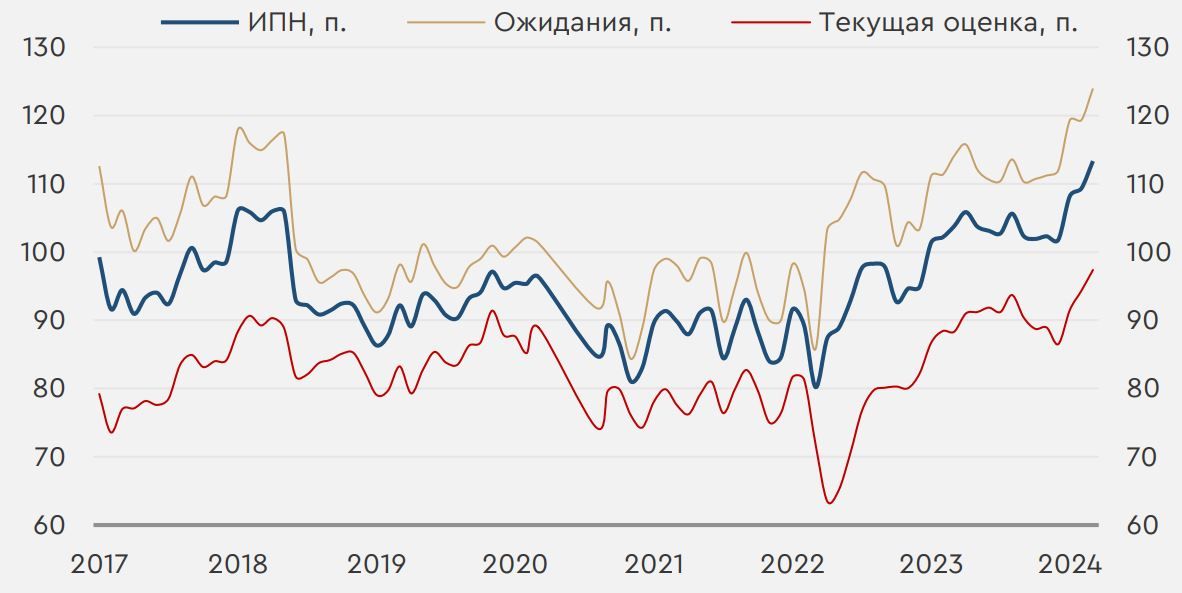 На мировом рынке в понедельник спрос на рисковые активы умеренно ослабился. Позитиву у инвесторов не способствовали комментарии главы Федерального резервного банка Атланты Рафаэля Бостика, высказавшегося за лишь одно снижение ставки ФРС в этом году. Из событий вчерашнего дня в РФ можно выделить публикацию Банком России полных материалов по мартовскому мониторингу предприятий, указавших на рост индикатора бизнес-климата в РФ до максимума за 12 лет при одновременном снижении ценовых ожиданий компаний и продолжившимся замедлении роста издержек. Статистика понедельника также свидетельствовала о росте индекса потребительских настроений россиян в марте до максимума с начала наблюдений в конце 2009-го года. Инвесторы в мире сегодня будут отыгрывать февральскую статистику по заказам товаров длительного пользования в США. В США сегодня также выйдет мартовский индекс потребительской уверенности от CB, который даст сигналы о состоянии спроса. На рынке РФ сегодняшний день отметится анонсом параметров последнего в этом году аукциона по размещению ОФЗ, а также публикацией февральской статистики по российскому банковскому сектору, которая позволит лучше оценить процесс трансмиссии ДКП Банка России. Нефть и рубль Цены на нефть вчера вернулись к росту. Такой динамике способствовало умеренное ослабление доллара вкупе с усилившимися опасениями перебоев в поставках. Сегодня фьючерсы Brent торгуются у $86,6/барр. На динамику котировок во вторник повлияет экономическая статистика из США и вечерние данные от API по запасам. В целом риски снижения нефтяных цен к $86/барр. пока сохраняются. В понедельник рубль умеренно укрепился. При этом объемы торгов пока низкие – это может свидетельствовать о том, что экспортеры еще не нарастили продажу валюты для уплаты налогов. Сегодня курс USDRUB находится у 92,8 руб./$. Другие курсы валют EM с утра двигаются разнонаправленно. Пока рубль может остаться вблизи текущих уровней, но ближе к пику налогового периода в четверг у него останется потенциал протестировать уровень в 92 руб./$. Индекс потребительских настроений в России Вчера ЦБ РФ опубликовал полные мартовские материалы по потребительским настроениям россиян. Составной индекс за месяц вырос на 4 п. до 113,3 п., до максимума с начала наблюдений в декабре 2009 года. При этом в марте существенно росли как оценки текущих условий, так и индекс ожиданий – оба показателя также обновили исторический максимум. По сути, потребительские настроения остаются устойчивыми к жесткой ДКП, что во многом происходит на фоне дефицита кадров и растущих зарплат. В таких условиях сложно ожидать резкое ослабления спроса и, соответственно, заметное замедление инфляции. Вчерашние данные, таким образом, напоминают о перспективах лишь слабого снижения ключевой ставки в текущем году. Индекс потребительских настроений в РФ и его субагрегаты