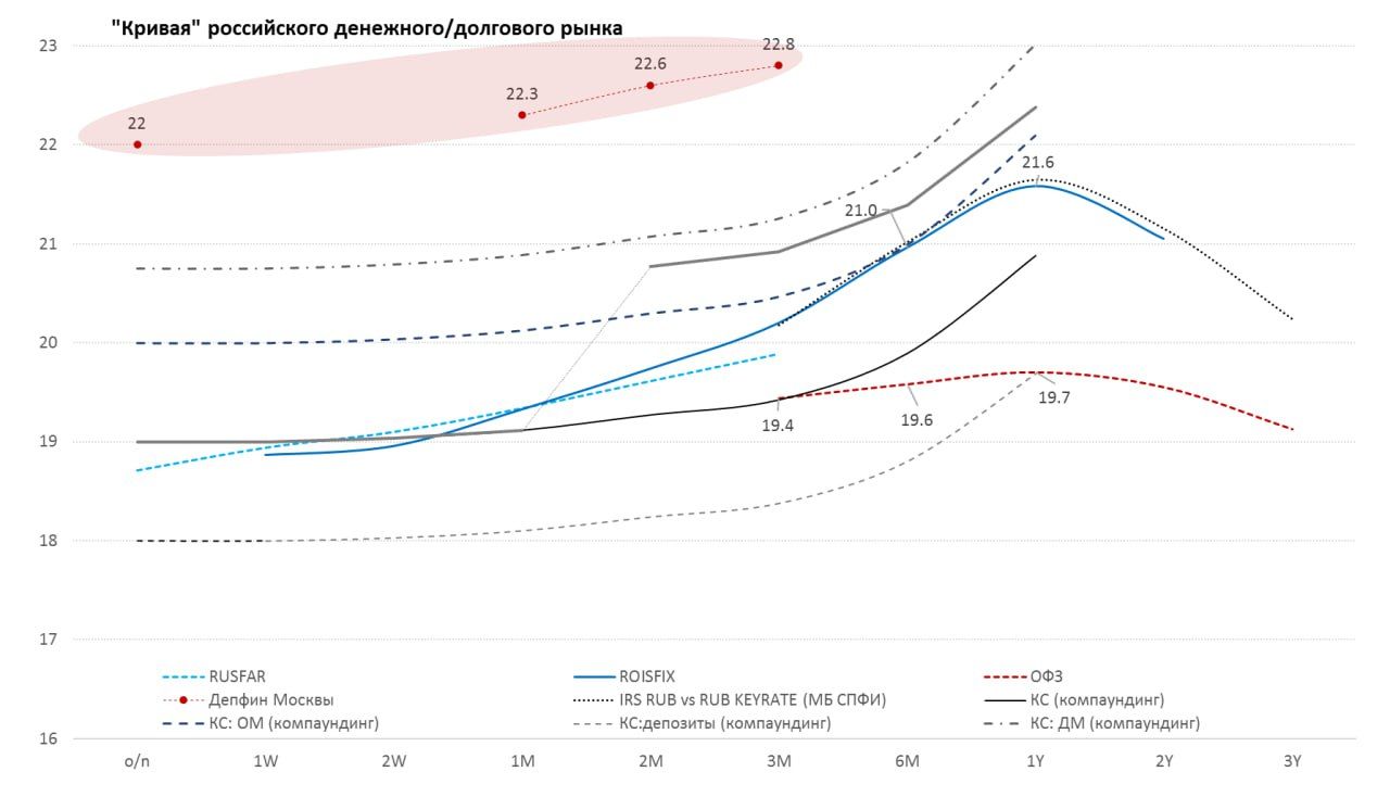 Ликвидность. Банк России опубликовал обзор по Денежно-кредитным условиям, указав на продолжение их ужесточения. На самом деле ужесточились они значительно больше, чем видно по RUONIA/RUSFAR/ROISFIX, что хорошо видно по депозитам Депфина Москвы, которые идут от 22% на овернайтах, а на более длинных депозитах ставки могут залетать под 23.5-24%, и это далеко за периметром коридора ставок ЦБ. Но процесс этот крайне неравномерен по банковской системе.