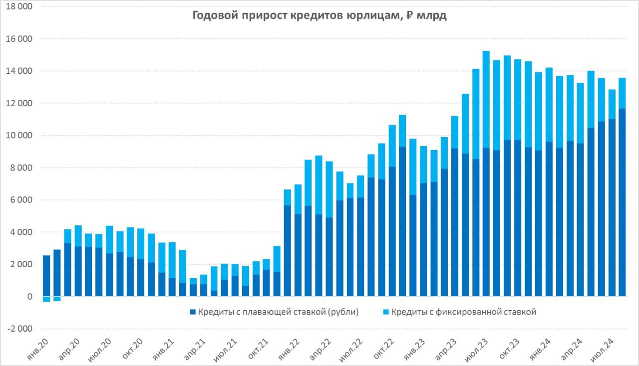 Отдельно уже пора обсуждать риски изменения структуры кредита в пользу кредитов с плавающей ставок. Прирост таких кредитов за год около ₽12 трлн (еще несколько трлн. облигации) – это основной источник прироста денежной массы М2. Такой переход позволил банкам выдавать значительно больше кредитов, не «покупая» процентный риск на свой баланс, а «продавая» его заемщикам... это же позволило компаниям значительно больше занимать, но впоследствии это чревато существенным ростом кредитных рисков для банков.