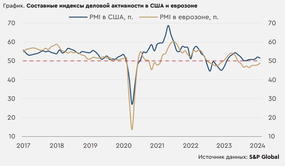 На мировом рынке на прошлой неделе наблюдалась умеренно позитивная динамика. С одной стороны, поддержку отдельным рисковым активам оказывали новости о дальнейшем стимулировании экономики Китая, а также публикация сильной отчетности ряда компаний. С другой стороны, особо выраженному позитиву не способствуют очередные сигналы от ФРС о перспективах более позднего снижения ставки в США. При этом февральские индексы деловой активности в США и в еврозоне были смешанными. На российском рынке в центре внимания были санкционные новости. Риски введения особо жестких ограничений, в частности на НКЦ, не реализовались. Тем не менее санкции были введены против большого числа иностранных компаний, что в среднесрочной перспективе может усилить волатильность в торговых потоках. На этой неделе инвесторы в мире обратят внимание на вторую оценку ВВП США в четвертом квартале, а также на февральские данные по инфляции в еврозоне. Ускорение роста цен окажет евро дополнительную поддержку. Российский рынок сейчас будет отыгрывать геополитические новости после длинных выходных. Отметить стоит также публикацию целого ряда январской экономической статистики и новых материалов от ЦБ – резюме обсуждения ключевой ставки, которое выйдет во вторник. Нефть и рубль. Нефтяные цены по итогам прошлой недели снизились. Давление на котировки оказали данные о дальнейшем росте запасов в США, а меры по стимулированию экономики КНР были в большей степени направлены на поддержку сектора недвижимости, что ограничивает позитив для рынка нефти. Сегодня фьючерсы Brent торгуются у $81,5/барр. Пока риски со стороны предложения нефти остаются высокими, и котировки в ближайшие дни могут остаться выше $80/барр. На прошедшей неделе рубль умеренно ослабился. В преддверии длинных выходных и в ожидании введения новых санкций на валютном рынке в моменте заметно усиливалась волатильность, но риски введения ограничений на НКЦ не реализовались. Сегодня курс USDRUB находится у 92,7 руб./$. Другие курсы валют EM с утра двигаются разнонаправленно. В целом на фоне налогового периода у курса есть потенциал опуститься к 92 руб./$. Индексы деловой активности в США и в еврозоне. Февральские индексы PMI указали на замедление роста деловой активности в США в связи с ухудшением ситуации в сфере услуг, в то время как производственный индекс вырос сильнее ожиданий. В еврозоне составной показатель, наоборот, вырос, хоть и остался ниже 50 п., что свидетельствует о, хоть и замедлившимся, но все еще сокращении деловой активности. Одновременно составляющие показателей указали на заметное ослабление ценового давления в США, в то время как рост издержек и отпускных цен в еврозоне ускорился до максимумов с мая. На этом фоне ЕЦБ может придерживаться более жесткой позиции, что поддерживает укрепление евро.