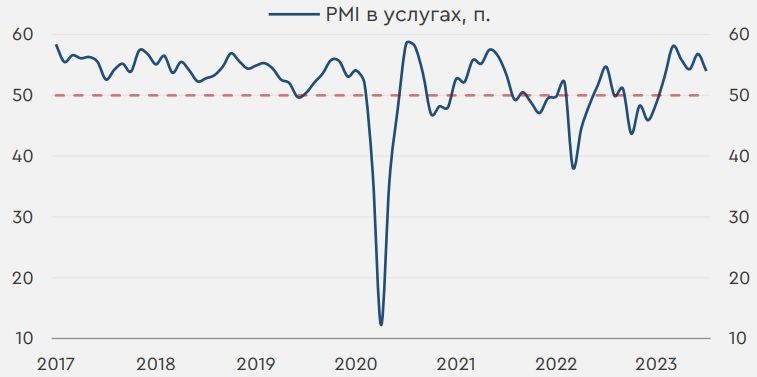 В центре внимания. На глобальном рынке в четверг вновь превалировали негативные настроения. Инвесторы продолжили отыгрывать снижение кредитного рейтинга США, дополнительное давление на рисковые активы вчера могло оказать более сильное, чем ожидалось, снижение июльского индекса деловой активности в сфере услуг США. В России вчерашний день отметился анонсом объемов операций с юанем по бюджетному правилу и публикацией июльского индекса деловой активности в российской сфере услуг. Сегодня динамика мирового рынка определится июльской трудовой статистикой в США. Более резкий, чем ожидается, рост занятости напомнит о сильном состоянии американского рынка труда, увеличив вероятность еще одного повышения ставки ФРС. При этом данные по динамике зарплат могут указать на риски более устойчивой инфляции, что также негативно скажется на рисковых активах. В России сегодня инвесторы продолжат следить в первую очередь за динамикой рубля. Нефть и рубль. Вчера нефтяные цены смогли резко вырасти в рамках коррекции. Поддержку котировкам оказали новости о продлении на сентябрь добровольного сокращения добычи Саудовской Аравией и нефтяного экспорта Россией, хоть и на 0,3 млн барр./сутки после августовских 0,5 млн барр./сутки. Сегодня фьючерсы Brent торгуются у $85,3/барр. Если сегодняшние данные по рынку труда США не будут неожиданно сильными, фьючерсы Brent могут остаться выше $84,5/барр. Рубль в четверг продолжил слабеть. Минфин вчера объявил о начале покупок юаней и золота с 7 августа объемом в 1,8 млрд руб. в день. Тем не менее с учетом ранее анонсированных ЦБ операций по зеркалированию инвестиций из ФНБ в чистом объеме продажа юаней в августе продолжится, хоть и в незначительном размере (~0,5 млрд руб. в день). Сегодня курс USDRUB находится у 94,4 руб./$. Другие валюты EM с утра преимущественно слабеют. В целом на фоне улучшившейся ситуации на нефтяном рынке у рубля остается потенциал к укреплению. Тем не менее в ближайшее время риски роста курса USDRUB выше 95 руб./$ сохранятся, особенно с понедельника, когда продажи по бюджетному правилу снизятся с текущих. Индекс деловой активности в сфере услуг РФ. Вчера утром в России был опубликован июльский индекс PMI в сфере услуг. Показатель за месяц снизился на 2,8 п. до 54 п., но остался на исторически высоких уровнях. Значения индекса выше 50 п. свидетельствуют о росте деловой активности, ниже – о ее сокращении. Рекордный рост российской сферы услуг замедляется, что во многом связано со снижением числа новых заказов, особенно экспортных. Составляющие показателя при этом указали на ускорившийся до полугодовых максимумов рост издержек, в то время как темпы роста отпускных цен в сфере услуг РФ стали рекордными с мая 2022 года. Индекс PMI по российскому производству ранее также указывал на усиление ценового давления, что напоминает о перспективах дальнейшего роста ключевой ставки в РФ как минимум к 9,5% годовых. График. Индекс деловой активности в сфере услуг РФ