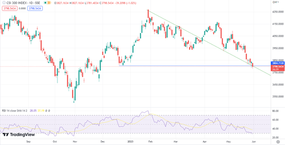 CSI 300 Индекс CSI 300 опустился до уровня поддержки около 3800 пунктов. Следующим может стать уровень 3675 пунктов. Однако возможен и разворот с коррекцией до отметки 3930 пунктов, так как RSI уже вошел в зону перепроданности.