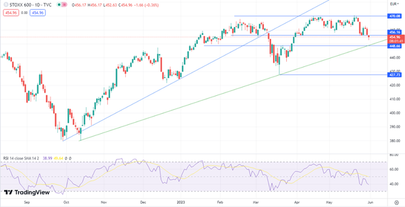 STOXX Europe 600 Индекс STOXX 600 вышел из консолидации вниз. Теперь его ближайшая остановка возможна в районе 450 пунктов.