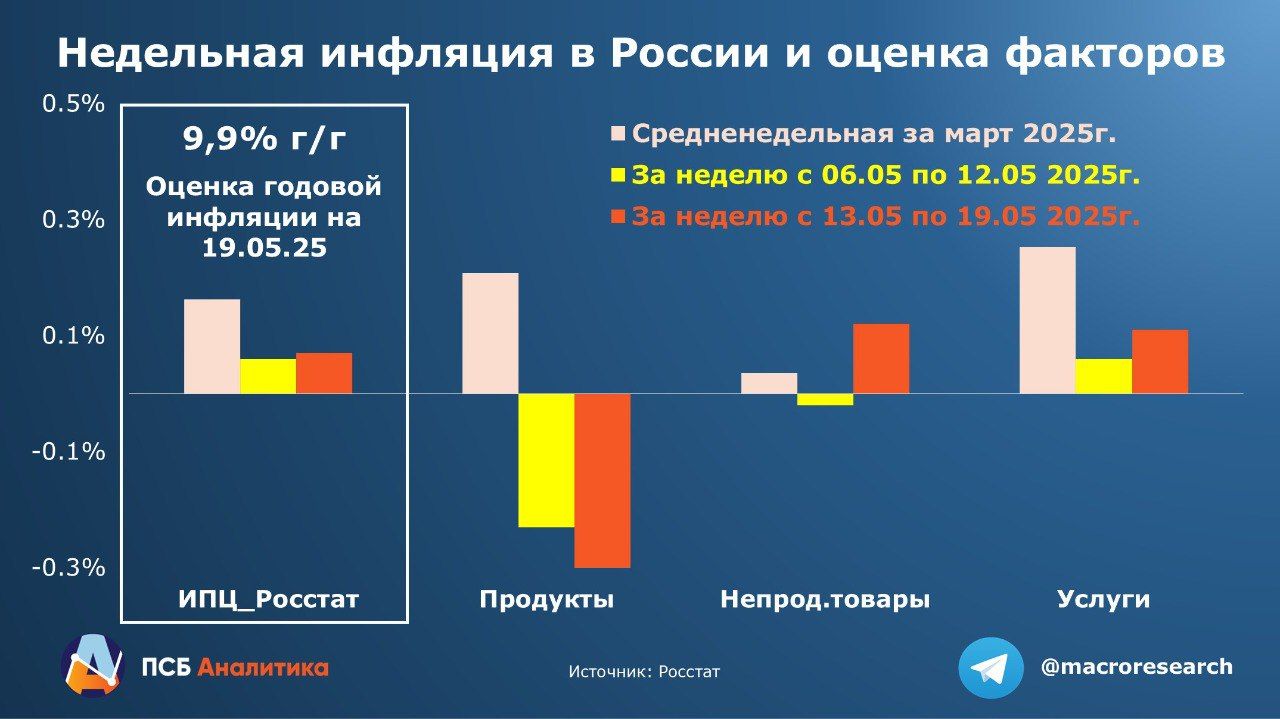 С 13 по 19 мая рост цен существенно не изменился (0,07% после 0,06% неделей ранее). При этом годовой уровень инфляции опустился до 9,9% г/г, с 10,4% в первой половине апреля. Отставание показателя от прогноза ЦБ усиливается, так как регулятор ориентировался на 10,1% г/г на конец II кв. 2025 года. При этом по разделам инфляции ситуация не такая однозначно позитивная. За счёт лекарств, электроники и некоторых других позиций неожиданно сильно ускорился рост цен на непродовольственные товары, несмотря на сохранение крепкого рубля. Продукты питания продолжают дешеветь, но ценовая динамика внутри группы разнонаправлена. Снижение индекса цен идёт за счёт удешевления овощей, круп, молочки, яйца и сахара. Однако число продуктов питания, по которым фиксируется рост цен, за неделю расширилось, как и в целом по всем наблюдаемым товарам и услугам. Инфляция устойчиво формирует аргументацию для снижения ключевой ставки. Тем не менее, ЦБ скорее всего сохранит паузу в принятии решения, опираясь на рост инфляционных ожиданий. Впрочем, долго тянуть при такой инфляции, и с учётом наблюдаемого охлаждения экономики, регулятор не сможет.