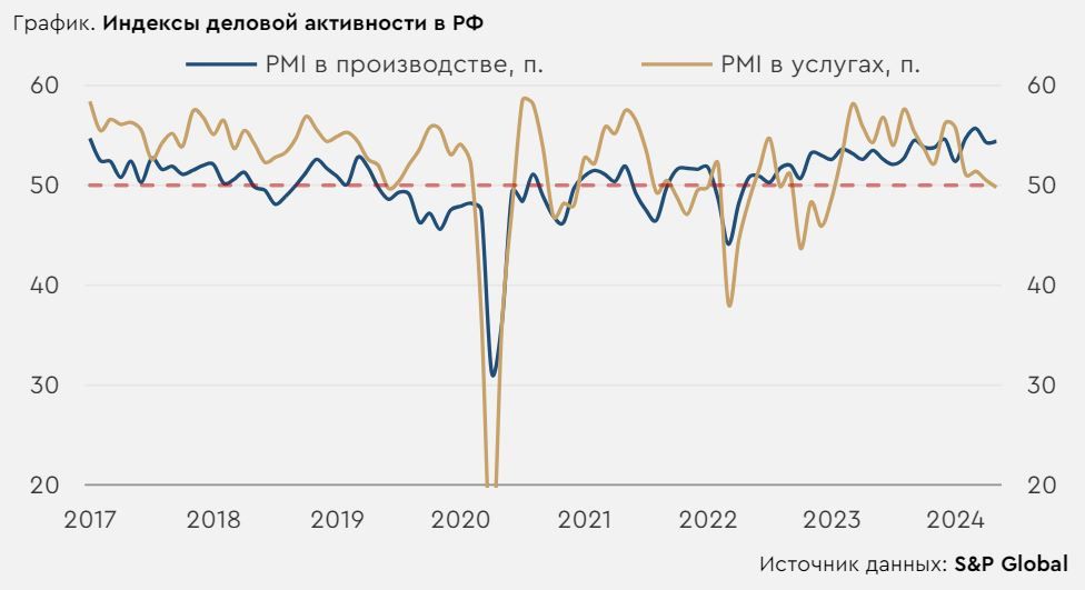 В центре внимания. Во вторник на глобальном рынке превалировали умеренно позитивные настроения. Вчерашние данные показали, что в апреле число открытых вакансий в США снизилось с 8,35 млн сразу до 8,06 млн (прогноз 8,34 млн), обновив минимум с февраля 2021 года. Постепенная нормализация ситуации на американском рынке труда может способствовать смягчению позиции ФРС, и инвесторы позитивно восприняли вчерашнюю статистику. В России вторник отметился коррекционным ростом рынка акций и отменой аукционов по размещению ОФЗ, что позволило доходностям на долговом рынке снизится. Сегодня инвесторы в мире будут отыгрывать публикацию майских данных по деловой активности в американской сфере услуг и оценок занятости от ADP, которые будут важными в преддверии выхода официальной статистики в пятницу. В России сегодня выйдет целый блок экономических данных, которые определят решения ЦБ на заседании в пятницу – помимо традиционных недельных цифр по инфляции, Росстат сегодня опубликует апрельскую статистику по рынку труда и по розничным продажам. При этом утренние данные указали на снижение составного индекса деловой активности в РФ в мае до минимума с начала 2023 года. Нефть и рубль. Цены на нефть вчера продолжили снижаться. Помимо ожиданий увеличения предложения нефти со стороны ОПЕК+, на котировки давление оказывают вчерашние данные от API, неожиданно показавшие максимальный с конца апреля недельный рост запасов нефти. Сегодня фьючерсы Brent торгуются у $77,4/барр. Если официальная статистика от Минэнерго США сегодня подтвердит оценки API, котировки рискуют на время опуститься ниже $77/барр. Во вторник рубль вновь укрепился. При этом объемы торгов остались повышенными. Сегодня курс USDRUB находится у 88,9 руб./$. Другие курсы валют EM с утра двигаются разнонаправленно. Сегодня Минфин должен анонсировать июньские объемы операций с валютой по бюджетному правилу. Если покупки заметно вырастут, а чистые продажи со стороны ЦБ, соответственно, снизятся, курс будет тяготеть к росту в сторону 90 руб./$. Деловая активность в России. Сегодняшние данные за май указали на снижение составного индекса PMI в РФ на 0,5 п. до 51,4 п., минимума с января 2023 года. Значения показателя выше 50 п. указывают на расширение деловой активности, ниже – на ее сокращение. Рост деловой активности в российском производстве умеренно ускорился, но индекс по сфере услуг за месяц снизился с 50,5 п. до 49,8 п., указав на первое с начала 2023 года сокращение деловой активности в секторе услуг РФ. Такую динамику бизнес связывает с ослабившимся спросом на услуги, но в производстве высокий спрос сохраняется. Предприятия также отметили ускорившийся до максимумов за 4 месяца рост издержек, что способствовало более высоким темпам повышения отпускных цен. В целом в мае наблюдается умеренное охлаждение российской экономики, но усилившееся ценовое давление все же не располагает к смягчению позиции ЦБ РФ.