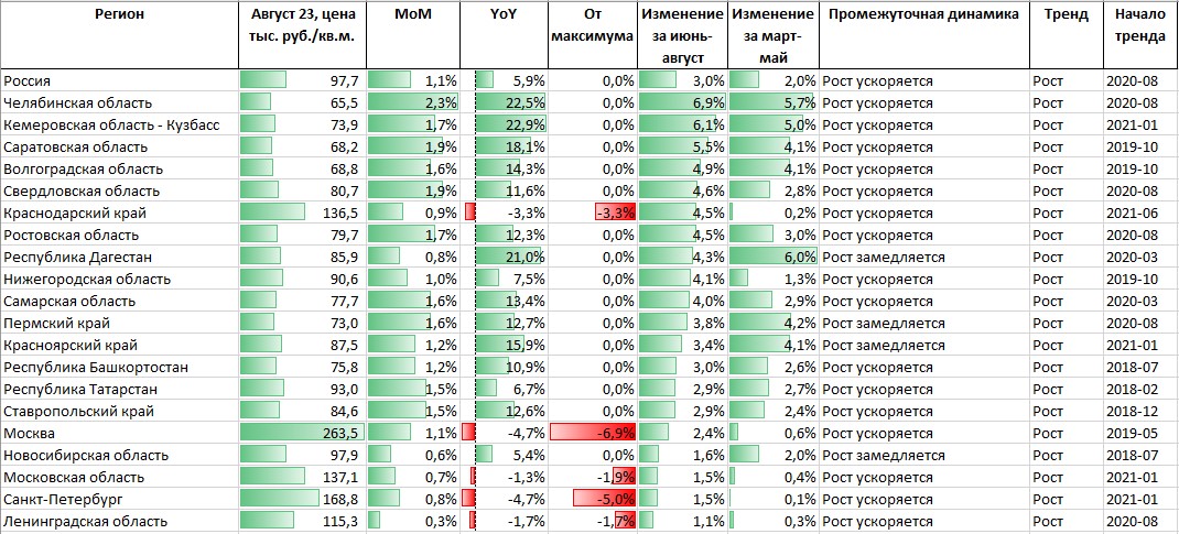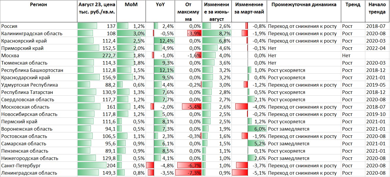 СберИндекс и Домклик опубликовали средние цены квадратного метра по фактическим ипотечным сделкам Сбера по регионам России за август 2023 года. В августе цена на новостройки в России составила 137 тыс. руб., что на 2,4% выше значения прошлого года. В 68 регионах за месяц цены на новостройки выросли, при этом в 49 регионах цены на новостройки обновили исторический максимум. Из регионов с наибольшими объёмами строительства третий месяц подряд сильнее всего выросли цены в Калининградской области (до 108 тыс. руб., +3% м/м) и в Красноярском крае до (112,4 тыс. руб., +2,5% м/м), а также в Приморском крае (до 152,5 тыс. руб., +2% м/м). Наибольшее снижение цен произошло в Кабардино-Балкарской Республике (до 62,2 тыс. руб., -3% м/м), Республике Саха (Якутия) (до 162,1 тыс. руб., -1,7% м/м) и в Амурской области (до 134,3 тыс. руб., -1,5% м/м), при этом в Республике Саха (Якутия) цены падают уже четвёртый месяц подряд, а в Амурской области — пятый месяц подряд. В Москве цены на новостройки за месяц выросли до 272,7 тыс. руб., на 1,8%, — максимальный прирост с марта 2022 года, но пока остаются ниже цены августа 2022-го на 1% и ниже исторического максимума сентября 2022 года на 1,6%. В отсутствие среднесрочного тренда цены в Москве растут четвёртый месяц подряд. Цена на вторичное жильё в России растёт седьмой месяц подряд и в августе составила 97,7 тыс. руб., превысив исторический максимум на 1,1% (+5,9% г/г). В 81 регионе за месяц цены на вторичное жильё выросли, при этом в 72 регионах цены обновили исторический максимум. Из крупнейших по численности населения регионов сильнее всего выросли цены в Челябинской области (до 65,5 тыс. руб., +2,3% м/м), Саратовской области (до 68,2 тыс. руб., +1,9% м/м) и в Свердловской области (до 80,7 тыс. руб., +1,9% м/м). При этом в указанных регионах цены ежемесячно непрерывно растут уже более трёх лет подряд. Наибольшее месячное снижение цен на вторичное жильё произошло в Республике Ингушетия (до 43,2 тыс. руб., -4,6% м/м), в Республике Адыгея (до 84 тыс. руб., -0,2% м/м) и в Сахалинской области (до 137,6 тыс. руб., -0,2% м/м). В Москве цены на вторичное жильё выросли за месяц на 1,1%, до 263,5 тыс. руб., что ниже цены прошлого августа на 4,7% и ниже максимальной цены июня 2022 года на 6,9%. Цены в Москве растут пятый месяц подряд, наблюдается ускорение роста цен. Старший управляющий директор, директор Центра финансовой аналитики Михаил Матовников: Цены на новостройки ожидаемо отреагировали на рост спроса, последовавший за резким повышением ключевой ставки. В сентябре-октябре рост может продолжиться за счёт заявок, поданных в августе, но это не сформирует долгосрочного тренда. В дальнейшем мы ожидаем нормализации спроса на уровне июля или чуть выше, что вряд ли будет способствовать росту цен на первичку. При этом увеличение ключевой ставки до 13% неизбежно вызовет перераспределение спроса со вторичного рынка на первичный, что, возможно, приведёт даже к некоторому снижению цен на готовое жильё.