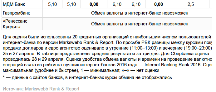 Агентство Markswebb Rank & Report по просьбе РБК изучило курсы покупки и продажи валюты в 20 крупнейших интернет-банках. Где и когда выгоднее всего менять валюту? По просьбе РБК аналитическое агентство Markswebb Rank & Report выяснило, в каких интернет-банках лучше всего менять валюту. Сотрудники агентства исследовали курсы покупки и продажи валют в 20 крупнейших интернет-банках с наибольшим числом пользователей. В течение трех дней (22, 25 и 27 апреля) утром и вечером аналитики собирали данные по курсам валют, чтобы понять: у каких банков минимальная разница между ценами покупки и продажи долларов и евро. Чем меньше эта разница (или, как говорят финансисты, спред), тем меньше банковский курс отличается от биржевого курса валюты. А значит, и потери при валютно-обменных операциях тоже меньше. Где менять Самая маленькая разница между ценой покупки и продажи — а значит, и лучшие курсы — у интернет-банка Тинькофф Банка. Спред при операциях с долларами в среднем по итогам измерений Markswebb Rank & Report составил 68 коп., а с евро — 77 коп. Другими словами, курсы этого банка отклоняются от биржевого примерно на 35 коп. в одну и другую сторону. Например, утром 22 апреля в 11:37 доллар на Московской бирже стоил 66,12 руб. Тинькофф Банк в эту минуту предлагал клиентам купить доллары по 66,40 руб, а продать — по 65,75 руб. Разница с биржевым курсом составляла 28 и 37 копеек соответственно. Спред, указанный в таблице, по сути показывает потери в рублях при одновременной покупке и продаже $1. В Тинькофф Банке система сама автоматически откупает в режиме реального времени ровно столько валюты, сколько требуется клиенту, рассказывает директор по коммуникациям банка Дарья Ермолина. Поэтому спреды настолько маленькие, добавляет она. Тинькофф Банк, очевидно, работает над привлечением тех, кто немного играет на валютном рынке или просто часто покупает валюту — для поездок или сбережений, добавляет гендиректор Markswebb Rank & Report Алексей Скобелев. Выгодные курсы также у банков «Хоум Кредит», «Открытие» и «Уралсиб». Во всех этих организациях разница между покупкой и продажей валюты в утренние и дневные часы меньше одного рубля. Самые большие спреды, а значит, самые невыгодные курсы, — у МДМ Банка (5,1 руб. по доллару и 6,1 по евро), Промсвязьбанка (4 руб. утром и 5 руб. вечером для обеих валют) и Сбербанка (3,84 по доллару и 4,1 по евро). Сколько это в деньгах? При покупке $1000 в интернет-офисе МДМ Банка утром 22 апреля пришлось бы заплатить на 2000 руб. больше, чем в интернет-банке Тинькофф Банка. «Сбербанк — один из крупнейших банков в России, и нам важно своевременно обеспечивать необходимый объем предложения своим клиентам без потери качества обслуживания, несмотря на внешние факторы», — прокомментировала пресс-служба Сбербанка политику валютообменных операций. «Сбербанк может позволить себе зарабатывать на большой неискушенной массе клиентов», — откликается на это Скобелев из Markswebb Rank & Report. В свою очередь, МДМ Банк в рамках интеграции с Бинбанком скоро пересмотрит курсовую политику по конверсионным операциям, отмечает пресс-служба этого банка. Все параметры будут идентичны тем, которые использует Бинбанк: то есть утренние спреды будут равны примерно 2 руб. для долларов и евро.