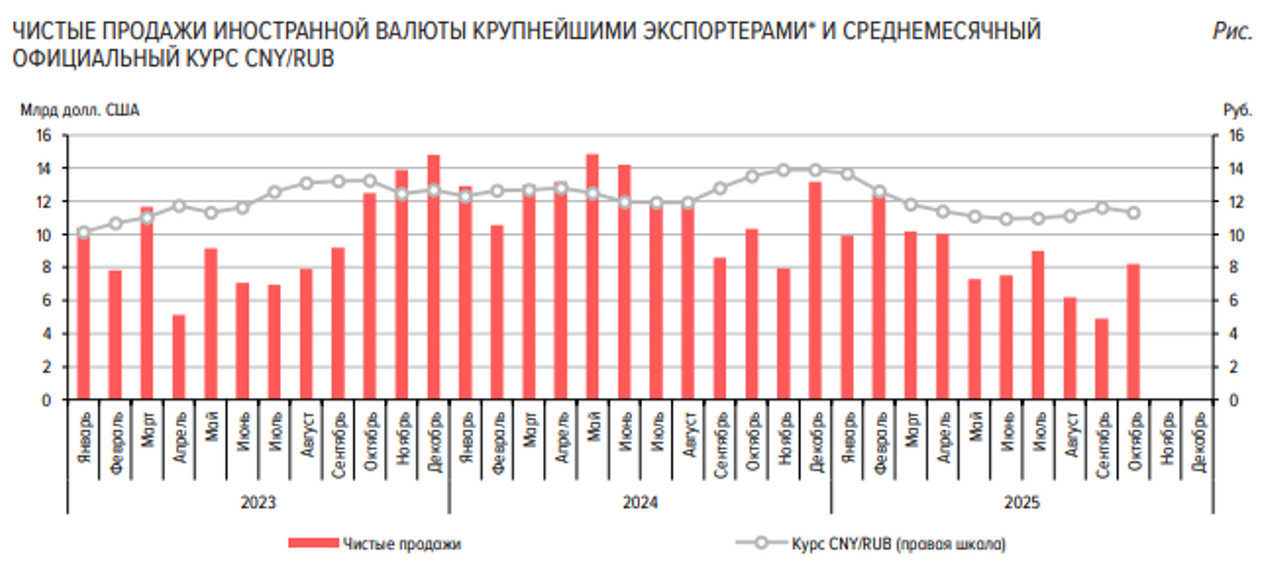 Снижение наблюдается и в биржевом индексе на 95-ый бензин, однако тут движение вниз началось чуть позже – с 27.10. В годовом же выражении мы по-прежнему наблюдаем достаточно сильный рост цены более, чем на 14,7%. Это отмечает и ЦБ в своём материале «Резюме обсуждения ключевой ставки» (далее Резюме): высокими темпами росли цены на нефтепродукты из‑за временного снижения предложения и сезонного роста спроса в летние месяцы. Для стабилизации ситуации Правительство Российской Федерации приняло меры по ограничению экспорта и наращиванию предложения на внутреннем рынке. В Резюме Банк России также отметил, что с прошлого заседания появились новые проинфляционные факторы. Эти факторы могут временно усилить инфляционное давление. Среди них – повышение НДС с 20 до 22% в 2026 году, более высокая индексация коммунальных тарифов в ближайшие годы, изменение порядка расчета утилизационного сбора для импортных автомобилей и ситуация на рынке моторного топлива. Обратим также внимание, что с 01.09.2026 г. планируется ввод т.н. технологического утильсбора, который вначале распространится на импорт ноутбуков, смартфонов и светотехники, после чего будет расширен на компоненты и модули. По нашему мнению, это создает ещё один проинфляционный фактор. Касаемо же курса рубля, в Резюме Банк России написал, что укрепление рубля с начала года в основном уже отразилось в ценах. Было отмечено, что компании в свои бизнес-планы закладывают более слабый курс, чем его текущие уровни. Поэтому при отсутствии значимых внешних шоков динамика курса не должна создавать существенных рисков для инфляции в ближайшие месяцы. Комментируя ситуацию, которая сложилась на валютном рынке в октябре в своём свежем Обзоре рисков финансовых рынков, регулятор заметил, что в октябре рубль оставался стабильным относительно основных иностранных валют, изменяясь в пределах диапазона колебаний, наблюдавшегося последние полгода. Стабильности рубля способствовал рост объема продаж со стороны экспортеров и сохранение спроса на валюту на стабильном уровне. Продажи со стороны экспортеров выросли на 68% м/м относительно предыдущего месяца, до 8,2 млрд долл. США, однако остались на уровне средних значений за 2025 г. (-4% к среднему значению). Нетто-покупки валюты физическими лицами на биржевом и внебиржевом рынках существенно выросли относительно предыдущего месяца и составили 158,6 млрд руб. (прим. это максимальный объем с мая 2024 г.), что обусловлено разовыми факторами. Накопленный объем покупок с начала года составил 918 млрд руб. (в 1,2 раза меньше, чем за аналогичный период 2024 г.). Спрос на валюту со стороны юридических лиц (без учета банков) в октябре увеличился по сравнению с сентябрем с 2,8 трлн до 3,0 трлн рублей.