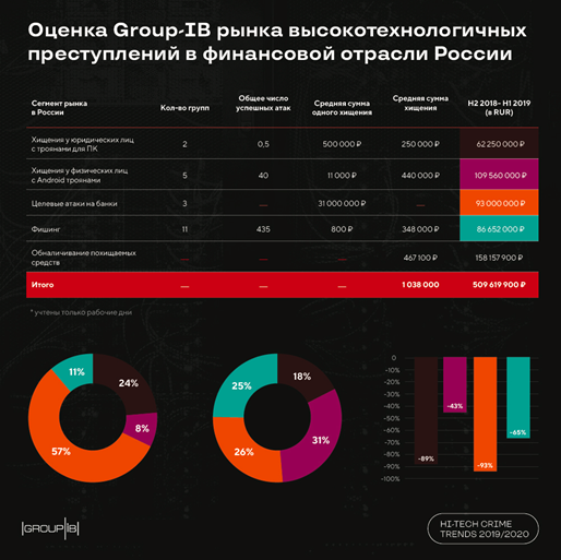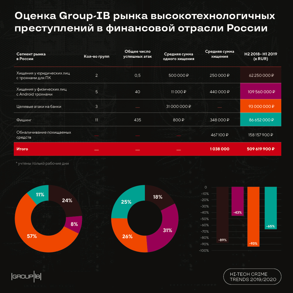 Москва, 29.11.2019 — Group-IB, международная компания, специализирующаяся на предотвращении кибератак, представила глобальный отчет о высокотехнологичных преступлениях Hi-Tech Crime Trends 2019-2020. Сокращение в России ущерба от всех видов киберпреступлений с использованием вредоносных программ, направленных как напрямую на банки, так и их клиентов привело к рекордному падению рынка на 85%. Согласно оценке Group-IB рынок высокотехнологичных преступлений в финансовой отрасли России, сократился до 510 млн рублей за период H2 2018 — H1 2019 против 3,2 млрд рублей в предыдущем периоде. На фоне исхода финансово мотивированных группировок из зоны «РУ», сокращения числа Android-троянов и групп, занимающихся фишингом, в России растет количество преступлений против клиентов банков с использованием социальной инженерии и телефонного мошенничества. Целевые атаки на банки: смена фокуса
