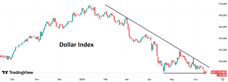 Главной новостью конца прошлой недели стала атака Израиля по ядерным и ракетным объектам Ирана для предотвращения создания ядерного оружия. Ответная реакция Ирана не заставила себя долго ждать. За прошедшие три дня стороны продолжают обмениваться интенсивными ракетными обстрелами. Сейчас главное - это оценить масштаб конфликта и возможное участие в нем других стран. Наиболее сильно эти обстрелы повлияли на цену нефти: котировки Brent c уровня $66,7/барр за три сессии подскочили до $77,5/барр. На втором месте по силе реакции – золото, котировки которого поднялись до $3450/унц., приблизившись к максимумам года. А вот на мировом валютном рынке реакция на эту геополитическую напряженность весьма слабая. В понедельник индекс доллара торгуется в районе 98,10 – уровень четверга прошлой недели. Курс евро консолидируется в районе 1,155 после уверенного подъема в конце прошлой недели. Японская иена, как индикатор отношения к защитным валютам этим утром торгуется возле 144,2 – это средний уровень с начала июня. Валюты, которые положительно коррелируют с риском, такие как австралийский доллар и новозеландский доллар, этим утром даже немного выросли, в то время как норвежская крона, как валюты страны-экспортера нефти укрепилась, достигнув самого высокого уровня с начала 2023 года. Для валютного рынка сейчас наиболее важно, что на этой неделе пройдут заседания ряда центральных банков. В центре внимания в среду будет заседание ФРС по денежно-кредитной политике. Во вторник Банк Японии вынесет свое решение по процентной ставке. Трейдеры в основном не ожидают увидеть здесь изменений в монетарной политике. Возможно, что БЯ рассмотрит возможность сокращения своих вложений в государственные облигации со следующего финансового года, поскольку правительство Японии настаивает на большем внутреннем владении ими. Этот фактор давно уже в рынке и мало влияет на курс иены. В конце прошлой недели индекс доллара переписал свои годовые минимумы, побывав на 97,7, поскольку инфляция в США оказалась слабее, чем ожидалось, что усилило надежды на снижение ставок ФРС. Надавило на доллар и то, что президент Д. Трамп объявил о планах направить официальные письма основным торговым партнерам на следующей неделе, в которых будут изложены односторонние тарифные меры, направленные на то, чтобы заставить страны заключить новые торговые соглашения, ведь 90-дневная отсрочка уже заканчивается. Статистика по США, опубликованная в конце прошлой недели показала, что годовой уровень инфляции в США вырос в мае до 2,4% с 2,3% в апреле, но оказался ниже ожиданий в 2,5%. В месячном исчислении ИПЦ вырос на 0,1%, ниже 0,2% в предыдущем месяце и прогнозов 0,2%. Годовая базовая инфляция, которая исключает волатильные цены на продукты питания и энергоносители, осталась на уровне 2,8%, хотя ожидался рост до 2,9%. Месячный базовый ИПЦ также вырос на 0,1%, ниже 0,2% в апреле и ожиданий 0,3%. Отчасти такая устойчивость потребительских цен в США объясняется тем, что в начале года компании очень активно импортировали товары перед основным повышением пошлин и весной продают эту продукцию еще по «старым» ценам. Ожидается, что в ближайшие месяцы инфляция в США будет расти по мере того, как влияние тарифов, введённых Трампом в апреле, будет острее ощущаться американскими потребителями. В настоящее время США взимают 10% пошлину с б