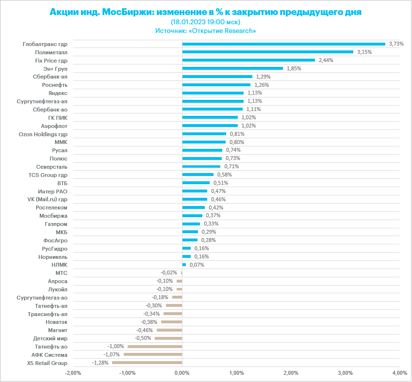 Рубль укрепился сегодня (минус для российских экспортеров). Цены на нефть обновили максимум с 5 декабря на уровне $87,84/барр. (Brent), что позитивно для компаний нефтегазового сектора. Внешний фон был позитивным для российского фондового рынка. Европейские акции выросли в среду, а вот американский фондовый рынок перешел к снижению в первой половине торгов, что могло подпортить настроения российских инвесторов в последний час торгов на Мосбирже. Темпы роста производителей в США в декабре, согласно опубликованным данным, упали сильнее ожиданий. Падение розничных продаж также превысило оценки, как и снижение промышленного производства. Это подразумевает, что ФРС близка к пику повышения ставок. Это позитив для рынка акций США. Однако инвесторы надеялись на то, что взять инфляцию под контроль ЦБ США удастся по сценарию мягкой посадки, без существенного роста безработицы. Однако Microsoft сообщил, что планирует сократить 10 тыс. рабочих мест. Bank of America приостанавливает наём новых сотрудников, за исключением самых важных позиций. Пока ранняя фаза сезона корпоративной отчетности повышает риск роста безработицы в Штатах.