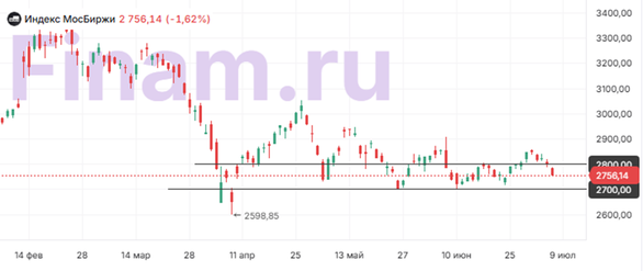 В понедельник, 7 июля, российский рынок акций завершает сессию снижением, оставаясь под давлением дивидендного гэпа, смешанных сигналов с зарубежных площадок, коррекции цен на металлы и геополитической неопределенности. Индекс МосБиржи просел до 2756,83 пункта (-1,6%), на фоне роста внешних рисков в виде новых антироссийских санкций и усиления опасений по поводу торговых войн. На фоне слабости акций, повышенный интерес инвесторов сохраняется к облигациям: индекс RGBI преодолел отметку 115 пунктов, что является максимумом с марта прошлого года. Крупнейшее снижение среди «голубых фишек» сегодня фиксируют бумаги МТС (–13,8%) вследствие закрытия реестра под дивиденды. Также в лидерах падения ОГК-2 (–3,8%), «СПБ Биржа» (–3,7%), «Распадская» (–3,6%), «Газпром» (–3,3%), «Мечел2 а.о. (–3,2%), «Мечел» а.п. (–3,1%), «Абрау Дюрсо» (–3,0%), «Северсталь» (–3,0%) и ПИК (–2,8%). Против рынка под конец дня растут «Магнит» (+0,61%), «ФосАгро» (+0,40%), «Совкомфлот» (+0,31%) и «Акрон» (+0,20%). Внешний фон остается преимущественно негативным: риторика США в отношении новых торговых пошлин поддерживает нервозность на мировых рынках. Дональд Трамп напомнил о возможности введения дополнительных пошлин для стран, не согласовавших условия с Вашингтоном, и грозит ставками до 60–70%. Металлы корректируются на опасениях за мировой спрос и возможное ужесточение торговых условий, тогда как нефть марки Brent после утренней просадки отскочила к $69 за баррель на фоне слабого доллара и новостей о повышении компанией Saudi Aramco цен на нефть для покупателей из Азии и Европы в августе. Решение ОПЕК+ повысить квоты на 548 тыс. б/с с августа формирует риск для баланса рынка и в перспективе может привести к неоптимальному увеличению предложения. Российский рынок остается во власти дивидендного сезона: на этой неделе пройдут ключевые отсечки по акциям «Московской биржи», «Совкомбанка», ВТБ, а позже — «Газпром нефти», ИКС 5, «Сбера», «Сургутнефтегаза», «Роснефти», «Транснефти». В ближайшие недели основное внимание будет приковано к предстоящему заседанию ЦБ РФ 25 июля: несмотря на ожидания снижения ставки, Банк России может действовать более осторожно на фоне индексации тарифов ЖКХ, что ограничивает потенциал для мягкой монетарной политики. Инвесторам, ориентирующимся на российский рынок, рекомендуем учитывать повышенную чувствительность акций к геополитическим новостям и сохранять осторожность при выборе стратегий, традиционно предлагая обратить внимание на нашу − «RU. Капитал и дивиденды». Технический анализ Индекс МосБиржи Технически Индекс МосБиржи закрепился ниже ключевого уровня 2800. Ближайшая цель «медведей» — тест зоны 2720–2700. В случае фиксации ниже 2700 давление может усилиться, однако на этих отметках вероятен рост спроса со стороны среднесрочных инвесторов.