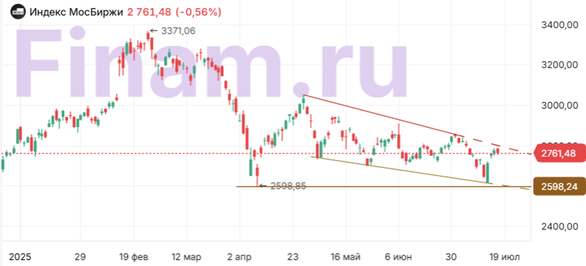 В четверг, 17 июля, российские индексы показали умеренное снижение, растеряв рост предыдущего дня. В их динамику вмешались дивидендные отсечки акций, входящих в расчет индексов. В остальном негативные и позитивные ожидания уравновешивали друг друга. С одной стороны, геополитика: российский МИД заявил, что Москва считает себя вправе применять оружие против военных объектов стран, которые позволяют Киеву своим вооружением бить вглубь РФ. С другой стороны, экономика: все ждут продолжения снижения ключевой ставки Банком России через неделю, в пятницу, 25 июля, и эти ожидания все смелее и смелее. Между тем, по данным Росстата, инфляция в РФ с 8 по 14 июля показала резкое снижение и составила всего 0,02% после единовременного скачка на 0,79% неделей ранее из-за объявленного роста коммунальных тарифов и после 0,07% двумя неделями ранее. С начала месяца рост цен в РФ к 14 июля составил 0,81%, с начала года — 4,61%. По итогам дня Банк России установил на 18 июля официальный курс доллара 78,1856 (+0,29%), курс евро — 90,9716 (+0,45%), курс юаня — 10,8787 (+0,34%). Цены на металлы повышаются. Котировки золота снижаются на 0,37% до $3334,50 за унцию. Фьючерсы на нефть марки Brent растут на 0,90% до $68,94 за баррель. На этом фоне к завершению дневной сессии Индекс МосБиржи отступил на 0,56% до уровня 2761,48 пункта, в то время как рассчитываемый в долларах индекс РТС понизился на 0,85% до 1112,64 пункта. В лидерах падения оказались бумаги, по которым сегодня закрываются реестры акционеров для получения дивидендов. Привилегированные акции «Сургутнефтегаза» показали гэп вниз на 13,48%, после того как вчера торговались последний день с дивидендами за 2024 год с доходностью 16,2%. Привилегированные акции «Транснефти» упали на 11,21% на дивидендной отсечке с доходностью 13,2%. Таким образом, эти бумаги упали меньше, чем на величину дивидендного дохода. Также на сопоставимой дивидендной отсечке снизились в цене обыкновенные акции «Сургутнефтегаза» (-3,91%) и «Т-Технологий» (-1,71%). Среди растущих бумаг в составе индексных бумаг — акции эмитентов, у которых реестр закрывается завтра. Лидирует «Аэрофлот» (+2,25%), акции которого последний день торгуются с дивидендами за 2024 год с доходностью около 8,5%. Также завтра произойдет отсечка на дивиденды по акциям «Сбера» обыкновенным (+1,35%) и привилегированным (+1,55%) и акциям «Роснефти» (+0,57%). ММК (-0,20%) представил операционные результаты за II квартал и I полугодие 2025 года. Производственные показатели сталевара продолжили положительное восстановление в поквартальном сравнении, но заметно снизились в сравнении с высокой базой сильного аналогичного периода прошлого года. Чистая прибыль компании «Росгосстрах» (-0,30%) в I полугодии 2025 года увеличилась на 4% (г/г) и составила 5 млрд руб. Инвесторам, ориентированным на акции отечественных компаний, мы рекомендуем обратить внимание на стратегию «RU. Капитал и дивиденды». Технический анализ Индекс МосБиржи Индекс МосБиржи все еще остается в состоянии консолидации, хотя диапазон с границ 2700 и 2900 пунктов переместился немного ниже, и теперь его границы расположены на 2600 и 2800 пунктов.