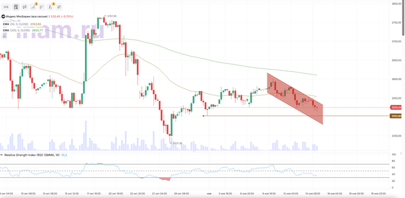В пятницу, 14 ноября, рынок завершает основную сессию в «красной зоне». Индекс МосБиржи падает на 0,68% до 2526,3 пункта, долларовый индекс РТС растет на 1,31% до 981,07 п. Официальный курс доллара США, установленный Центральным банком с 15 ноября, составляет 81,1276 руб. По сравнению с предыдущим значением курс вырос на 52,66 коп. Сегодня российский рынок акций перешел к снижению после роста накануне: в середине дня падение усилилось, и Индекс МосБиржи обновил минимумы ноября, опустившись ниже отметки 2520 пунктов. Давление на рынок оказали сообщения о возгорании на нефтебазе крупного перевалочного комплекса «Шесхарис», публикация ряда корпоративной отчетности, а также новость от Reuters о приостановке экспорта нефти через порт Новороссийск, хотя эта информация официально не подтверждена. Внешний долг России на 1 октября 2025 года достиг $305 млрд, увеличившись с начала года на $15,2 млрд, в основном из-за укрепления рубля, сообщает Центробанк. Профицит текущего счета за январь-сентябрь сократился до $30,1 млрд против $49,1 млрд годом ранее на фоне снижения торгового баланса и роста дефицита услуг. Лидерами роста фондового рынка сегодня стали «ВушХолдинг» (+2,37%), «Группа Позитив» (+1,53%), «Акрон» (+1,36%), «НоваБев Групп» (+1,30%), «СОЛЛЕРС» (+1,01%). Между тем в минусе финишировали бумаги «Селигдар» (-3,22%), «ОЗОН» (-2,46%), «Совкомфлот ПАО» (-2,31\4%), ТМК (-2,33%). «Совкомфлот» отчитался за 9 месяцев 2025 г.: выручка на основе тайм-чартерного эквивалента составила $763 млн (-37 % г/г), что немного выше наших ожиданий. Показатель скорр. EBITDA снизился на 54% (г/г), до $390 млн, с маржинальностью 41% (-17 п. п. г/г). Скорректированный убыток за период составил $8 млн против прибыли в прошлом году. Ключевыми факторами стало усиление санкционного давления со стороны США и ЕС, приведшее к простою части флота и ограничению доступа к ключевым портам, а также снижение фрахтовых ставок. Акции компании снижаются на 2,34%. «Селигдар» за 9 месяцев 2025 года увеличил выручку на 44% (г/г), до 61,8 млрд руб., а EBITDA — на 53% (г/г), до 29,6 млрд руб. Чистый убыток компании снизился на 24% (г/г) и составил 7,7 млрд руб. Акции снижаются на 2,59%. «Совкомбанк» за 9 месяцев 2025 года увеличил выручку на 38% (г/г) до 703 млрд руб., а чистые комиссионные доходы выросли на 34% (г/г). Несмотря на это, чистая прибыль снизилась на 38% (г/г) и составила 35 млрд руб. Акции падают на 2,31%. Инвесторам, интересующимся российским рынком акций, мы по традиции рекомендуем обратить внимание на стратегию «RU. Капитал и дивиденды». Технический анализ Индекс МосБиржи Индекс МосБиржи на 4-часовом таймфрейме движется в нисходящем канале. Зоной поддержки может выступать уровень в 2502 п.