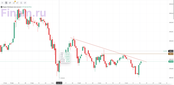 В среду, 16 июля, рынок завершил основную сессию в зеленой зоне. Индекс МосБиржи вырос на 0,73% до 2777,16 пункта, долларовый Индекс РТС прибавил 0,73% до 1122,22 п. Официальный курс доллара США, установленный Центральным банком с 17 июля, составляет 77,96 руб. По сравнению с предыдущим значением курс вырос на 0,01 коп. Курс евро снизился до 90,56 рубля, на 58,9 коп. Сегодня Индекс МосБиржи демонстрирует рост. Акцент участников смещается с внешнеполитических событий на предстоящее заседание Банка России по ключевой ставке. Рынок также будет оценивать еженедельные данные по инфляции. Аналитики, опрошенные Банком России, понизили прогноз инфляции на 2025 год до 6,8%; достижение таргета в 4% возможно к 2028 году, по результатам опроса. Также были пересмотрены в сторону понижения ожидания по ключевой ставке, которая может снизиться до 8,5% к 2028 году. Прогнозируется укрепление рубля и умеренные темпы роста ВВП. До конца недели дополнительное давление на рынок окажет серия дивидендных отсечек крупных эмитентов. На внешнем контуре все еще сохраняется неопределенность, связанная с обсуждением очередного пакета антироссийских санкций ЕС, включая возможное введение нового потолка цен на нефть. Согласно результатам июльского опроса Банка России, рост экономической активности предприятий в стране замедлился. Индикатор бизнес-климата (ИБК) в июле составил 1,5 пункта против 3,0 пункта месяцем ранее, что указывает на сдержанное отношение бизнеса как к текущей, так и к ожидаемой динамике производства и спроса. Лидерами роста фондового рынка стали «Ростелеком» (+4,25%), «Селигдар» (+3,93%), «Алроса» (+3,30%), «Транснефть» ап (+3,21%), «Сургутнефтегаз» (+3,03%). Между тем в минусе финишировали бумаги СПБ Биржи (-2,93%), «Вуш Холдинга» (-2,16%), «Мечела» (-1,56%), «Позитива» (-0,92%). Ритейлер ИКС 5 опубликовал операционные результаты за II квартал 2025 года. Чистая розничная выручка компании увеличилась на 21,6% по сравнению с аналогичным периодом прошлого года и составила 1,17 трлн рублей. Акции компании растут на 0,62%. Инвесторам, интересующимся российским рынком акций, мы по традиции рекомендуем обратить внимание на стратегию «RU. Капитал и дивиденды». Технический анализ Индекс МосБиржи Индекс МосБиржи на дневном таймфрейме подходит к наклонной линии, которая может выступать сопротивлением в зоне 2800 пунктов. Если цена пробьет наклонную и закрепится выше, следующей целью может стать уровень сопротивления на уровне 2860.