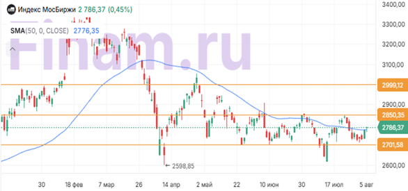 Российский фондовые индикаторы изменились разнонаправленно во вторник, 5 августа, при этом Индекс МосБиржи продолжил подъем, несмотря на сохранение повышенных геополитических рисков. Отечественные инвесторы, по-видимому, рассчитывают, что санкции США против РФ и ее основных партнеров, которые президент Дональд Трамп грозит ввести после истечения через несколько дней ультиматума для урегулирования ситуации на Украине, окажутся не такими жесткими, как заявляется. В этой связи хорошим знаком видится предстоящий визит в Москву спецпосланника Трампа Стива Уиткоффа, с которым, по сообщениям СМИ, может встретиться Владимир Путин. На какие-то прорывные договоренности по урегулированию украинского конфликта вряд ли стоит рассчитывать, однако сам факт продолжения переговоров между Россией и Штатами вселяет некоторый оптимизм. Внешний фон для российского рынка сегодня был неоднозначным. На зарубежных фондовых площадках преобладали в целом умеренно позитивные настроения, однако цены на нефть продолжили снижаться на недавнем решении ОПЕК+ по увеличению квот на добычу. По итогам основной сессии Индекс МосБиржи вырос на 0,45% до 2786,4 пункта, тогда как долларовый РТС уменьшился на 0,02% до 1096,5 пункта. Лидерами роста стали акции «Фармсинтеза» (+2%), ВТБ (+1,8%), МТС (+1,8%), «Роснефти» (+1,1%), «Северстали» (+1,1%), «Полюса» (+0,9%), «Фосагро» (+0,9%), Ozon (+0,8%). В минусе между тем завершили сессию бумаги СПБ Биржи (-1,6%), «Группы Позитив» (-1,4%), VK (-1,2%), АФК «Система» (-0,8%), «Новатэка» (-0,8%). «Норникель» вчера вечером отчитался о росте выручки по МСФО в I полугодии 2025 г. на 15% до $6,5 млрд. При этом показатель EBITDA повысился на 12% до $2,6 млрд, чистая прибыль — на 2% до $842 млн. Менеджмент компании заявил, что сохраняет цель по снижению оборотного капитала на $1 млрд в среднесрочной перспективе. Стоимость акций «Норникеля» увеличилась на 0,7%. Выручка «Ростелекома» по МСФО во II квартале 2025 г. увеличилась на 13% (г/г) до 203,5 млрд руб., сообщила компания. При этом значительный вклад в рост внесли цифровые кластеры и мобильный бизнес. Показатель OIBDA поднялся на 11% до 80,6 млрд руб., тогда как чистая прибыль упала в 2,2 раза до 6,1 млрд руб. Обыкновенные акции «Ростелекома» сегодня подорожали на 2,1%, привилегированные — на 1,7%. Инвесторам, интересующимся российским рынком акций, мы по традиции рекомендуем обратить внимание на стратегию «RU. Капитал и дивиденды». Технический анализ Индекс МосБиржи С точки зрения теханализа на дневном графике Индекс МосБиржи оттолкнулся от уровня поддержки 2700 пунктов, а также превысил 50-дневную скользящую среднюю. Следующее сопротивление расположено на отметке 2850 пунктов, и при его преодолении откроется дорога для роста в район 3000 пунктов.
