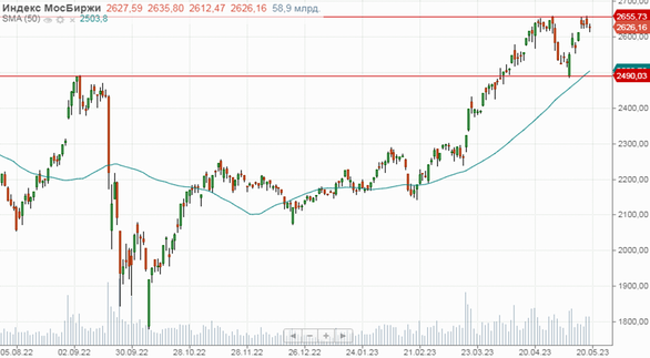 В пятницу, 19 мая, российские фондовые индикаторы завершили торги разнонаправленно, при этом Индекс МосБиржи умеренно понизился, но смог отыграть значительную часть утренней просадки, спровоцированной сообщениями о новых масштабных санкциях против РФ со стороны стран Запада. От большего снижения отечественные акции удержала в целом довольно благоприятная конъюнктура на зарубежных фондовых площадках, которые надеются на скорое разрешение вопроса с потолком госдолга в США. Кроме того, позитивную роль продолжил играть дивидендный фактор, несмотря на то, что в последние дни поступили негативные дивидендные новости от ряда эмитентов. В то же время так называемый «фактор пятницы», по-видимому, не позволил рублевому индикатору закрыть день в плюсе – многие инвесторы предпочли проявить осторожность перед выходными, учитывая, что в ближайшие дни объявить о новом пакете антироссийских санкций планирует еще и ЕС. Великобритания сегодня существенно расширила свой российский санкционный список. В него вошли в том числе такие компании, как «Северсталь», АФК «Система», «Полюс», ММК, ТМК, Росбанк, Тинькофф Банк, FESCO, несколько предприятий, связанных с «Росатомом», а также ряд физических лиц. Кроме того, Великобритания введет запрет на импорт российских алмазов, меди, никеля и алюминия. Между тем ближе к вечеру стало известно о новых антироссийских санкциях со стороны США – в частности, под блокирующие ограничения попали «Полюс» и «Полиметалл». По итогам сессии Индекс МосБиржи опустился на 0,26% до 2626,2 пункта, тогда как долларовый Индекс РТС поднялся на 0,31% до 1036,6 пункта. В лидерах снижения оказались бумаги «Полиметалла» (-10,7%), «Полюса» (-3,3%) «Сургутнефтегаза» (ап -2,9%), АФК «Система» (-2,7%), «РУСАЛа» (-2,6%), TCS Group (-1,4%), «Глобалтранса» (-1,4%). Между тем акции Группы ЛСР подскочили в цене на 18% в связи с тем, что совет директоров компании рекомендовал дивиденды за 2022 год в размере 78 руб. на бумагу. Акции «Яндекса» подорожали на 9,4% на новости о том, что компания получила предложения о покупке контрольного пакета от бизнесменов Владимира Потанина и Вагита Алекперова исходя из оценки в $7-7,5 млрд. Помимо этого, в неплохом плюсе завершили торги бумаги VK (+5,6%), «Ростелекома» (ао +2,1%), Ozon (+1,2%), «Аэрофлота» (+1,2%). Интернет-сайт по продаже недвижимости «Циан» представил неплохие финансовые результаты за I квартал 2023 года. Выручка выросла на 39% (г/г) до 2,4 млрд руб. благодаря существенному росту доходов от основного бизнеса (включает выручку от размещения объявлений, лидогенерации и медийной рекламы). При этом скорр. показатель EBITDA подскочил в 6,3 раза до 353 млн руб., чистая прибыль – в 4,8 раза до 211 млн руб. Бумаги «Циан» подорожали на 2,8%. Мобильный оператор МТС сообщил об увеличении выручки в I квартале на 5,8% (г/г) до 139,6 млрд руб. Показатель OIBDA повысился на 2,4% до 57,7 млрд руб., а чистая прибыль подскочила более чем в три раза и составила 12,7 млрд руб. Ранее стало известно, что совет директоров МТС рекомендовал дивиденды по итогам 2022 года в размере 34,29 руб. на акцию. Тем не менее котировки акций компании просели на 1,8%. Инвесторам, интересующимся российским рынком акций, мы по традиции рекомендуем обратить внимание на стратегию «RU. Капитал и дивиденды». Индекс МосБиржи С точки зрения теханализа на дневном графике Индекс МосБиржи оттолкнулся от уровня сопротивления 2655 пунктов. Ожидае