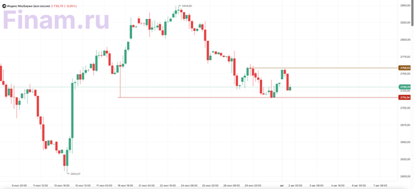 В пятницу, 1 августа, рынок завершает основную сессию в «красной зоне». Индекс МосБиржи падает на 0,15% до 2727,98 пункта, долларовый индекс РТС снижается на 0,17% до 1069,82 пункта. После умеренно положительного завершения сессии накануне, сегодня российский фондовый рынок попытался развить восходящий импульс, однако во второй половине дня настрой участников изменился, что привело к развороту индекса. Основным фактором давления остаются растущие опасения относительно возможного введения Соединёнными Штатами новых пошлин в отношении России и ее торговых партнеров. По мере приближения дедлайна 8 августа неопределенность усиливается, что сдерживает активность инвесторов. Определенную поддержку рыночным настроениям могли оказать новости о намечаемом визите в Россию спецпосланника президента США Стива Уиткоффа, однако сохраняющаяся геополитическая напряженность вынуждает большинство участников занимать осторожную, выжидательную позицию. Это выражается в сниженных объемах торгов и общей сдержанности на рынке. В краткосрочной перспективе динамика Индекса МосБиржи будет во многом зависеть от развития внешнеполитической ситуации и возможных заявлений со стороны США. Лидерами роста фондового рынка стали «Ростелеком» (+1,73%), «СПБ Биржа» (+1,60%), «Соллерс» (+1,54%), «Селигдар» (+1,53%), ВК МКПАО (+1,45%). Между тем в минусе финишировали бумаги «Камаза» (-2,37%), МКБ (-1,32%), «Норникеля» (-1,19%), ВТБ (-1,16%). Акционеры ТМК одобрили переход на единую акцию в результате присоединения восьми ключевых подконтрольных обществ к материнской компании. Реализация завершится до 31 декабря 2025 года. Акционеры, проголосовавшие против или не участвовавшие в собрании, могут подать свои акции к выкупу по цене 116,1 руб. за штуку до 15 сентября 2025 года. Выплаты будут произведены до 15 октября 2025 года. Акции компании растут на 1,4%. Чистая прибыль «Транснефти» по РСБУ за 1 полугодие 2025 года выросла на 40% (г/г) и составила 76,31 млрд рублей. Акции компании растут на 1,23%. Чистая прибыль «АЛРОСА» по РСБУ за 1 полугодие 2025 года увеличилась на 12% (г/г) и составила 39,03 млрд рублей. Однако акции компании падают на 0,52%. Выручка «Группы Позитив» в I полугодии 2025 года выросла до 6,7 млрд рублей (+28,8% г/г). По итогам шести месяцев работы объем отгрузок клиентам «Группы Позитив» увеличился до 7,4 млрд рублей с 4,9 млрд рублей ранее. Однако котировки снижаются на 0,35%. Инвесторам, интересующимся российским рынком акций, мы по традиции рекомендуем обратить внимание на стратегию «RU. Капитал и дивиденды». Технический анализ Индекс МосБиржи Индекс МосБиржи на 4-часовом таймфрейме приближается к уровню поддержки в 2715,34 п. Уровнем сопротивления может выступать зона 2758,52 п. Предположительно цена будет какое-то время торговаться в данном диапазоне.