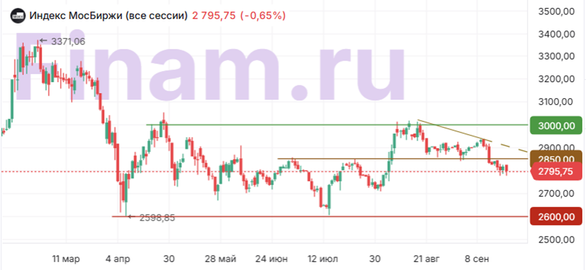 В четверг, 18 сентября, российский рынок акций возобновил снижение, несмотря на оптимистичную риторику про устойчивую динамику российской экономики на X Московском финансовом форуме. Негативные настроения инвесторов подогревались слухами о возможном повышении НДС для сокращения дефицита госбюджета, о котором сообщило агентство Reuters со ссылкой на свои неназванные источники. В то же время глава Банка России Эльвира Набиуллина на Московском финансовом форуме обозначила свою позицию: чем больше дефицит бюджета, тем жестче денежно-кредитная политика. Поэтому, считает она, Минфин должен иметь сбалансированный бюджет. А инфляция, по-видимому, уже не единственный критерий для ДКП ЦБ. Между тем, как показал Росстат, рост потребительских цен в РФ на неделе с 9 по 15 сентября составил 0,04% после роста на 0,10% неделей ранее и снижения на 0,08% двумя неделями ранее. Годовая инфляция в РФ по состоянию на 15 сентября замедлилась до 8,10% с 8,16% на 8 сентября, если ее оценивать по методике Банка России, и до 8,02% с 8,10%, если ее определять по методике Минэкономразвития. По итогам дня Банк России установил на 19 сентября официальный курс доллара 83,1725 (+0,21%), курс евро – 98,9773 (+0,69%), курс юаня – 11,6661 (+0,03%). Котировки золота снижаются на 0,56% до $3639,50 за унцию. Фьючерсы на нефть марки Brent падают на 0,65% до $67,52 за баррель. На этом фоне ближе к завершению дневной сессии Индекс МосБиржи понизился на 0,65% до уровня 2795,75 пункта, в то время как рассчитываемый в долларах Индекс РТС опустился на 0,85% до 1058,91 пункта (по состоянию на 18:40 мск). Положительную динамику в составе Индекса МосБиржи удалось сохранить только акциям ВТБ (+0,93%), «МД Медикал Груп» (+0,86%), Московской биржи (+0,23%), ВК (+0,23%) и «Северстали» (+0,14%). А в лидерах снижения оказались бумаги МКБ (−3,15%), «Россетей» (−3,05%), «Мосэнерго» (−2,50%), «Алросы» (−2,48%) и «Астры» (−2,46%). Акции «Алросы» «нырнули» вниз, после того как в кулуарах Московского финансового форума заместитель министра финансов Алексей Моисеев заявил журналистам, что ведомство поставило на паузу закупку алмазов в Гохран. Оператор краткосрочной аренды электросамокатов в России, компания «ВУШ Холдинг», представила операционные результаты за 8 месяцев 2025 года. Количество зарегистрированных аккаунтов увеличилось на 24% (г/г), флот сервиса электросамокатов вырос на 18% (г/г), однако количество поездок за этот период сократилось на 6% (г/г). Акции компании упали в четверг на 2,25%. Группа Cian объявила, что получила разрешение регулятора Кипра на редомициляцию в Россию. Акции интернет-сервиса по торговле недвижимостью подскочили на 4,00%. Инвесторам, ориентированным на акции отечественных компаний, мы рекомендуем обратить внимание на стратегию «RU. Капитал и дивиденды». Техническая картина Индекс МосБиржи Локальный уровень поддержки в районе 2850 пунктов не устоял. Тем не менее Индекс МосБиржи остается в широком торговом диапазоне между 2600 и 3000 пунктов. Сейчас он консолидируется в середине этого диапазона, откуда возможно движение как к нижней, так и к верхней его границе.