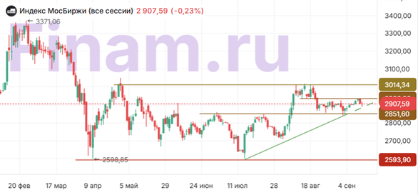 В четверг, 11 сентября, российский рынок акций в течение дня в среднем умеренно снижался на фоне инцидента с беспилотниками в Польше и ужесточения западной риторики. В то же время внимание биржевых игроков сосредоточено на завтрашнем заседании Банка России и его решении по ключевой ставке. Большинство аналитиков сходится на том, что ставка будет снижена на 2 п.п. Эти ожидания не позволили рынку пойти ниже, и к завершению дневной сессии Индексу МосБиржи удалось заметно сократить потери. Между тем рост потребительских цен в РФ на неделе со 2 по 8 сентября составил 0,10% после снижения на 0,08% неделей ранее и роста на 0,02% двумя неделями ранее. По оценке Минэкономразвития, инфляция в России на 8 сентября составила 8,1% в годовом выражении против 8,11% неделей ранее. Положительное внешнеторговое сальдо РФ, по данным Федеральной таможенной службы, в январе-июле 2025 г. сократилось по сравнению аналогичным периодом прошлого года на 14,1% и составило $77,2 млрд. Экспорт товаров из РФ за первые семь месяцев года снизился в годовом выражении на 4,7% — до $232,6 млрд, в то время как импорт вырос на 0,8%, до $155,4 млрд. При этом в июле профицит внешней торговли РФ вырос на 42% (м/м) и на 29,6% (г/г), составив $13,2 млрд. По итогам дня Банк России установил на 12 сентября официальный курс доллара 85,6647 (+0,88%), курс евро – 99,7367 (-0,09%), курс юаня – 11,9373 (+0,35%). Котировки золота снижаются на 0,11% до $3636,80 за унцию. Фьючерсы на нефть марки Brent падают на 1,60% до $66,40 за баррель после того, как ОПЕК в ежемесячном отчете сообщила об увеличении добычи нефти в августе на 529 тыс. б/с по отношению к июлю и оставила неизменным прогноз по темпам роста спроса на нефть на уровне 1,29 млн б/с в 2025 году и на уровне 1,38 млн б/с в 2026 году. На этом фоне ближе к завершению дневной сессии Индекс МосБиржи понизился на 0,23% до уровня 2907,59 пункта, в то время как рассчитываемый в долларах индекс РТС опустился на 1,10% до 1069,23 пункта (по состоянию на 18:40 мск). В лидерах роста среди акций, включенных в состав индексов, оказались Банк ВТБ (+5,11%), ЮГК (+3,40%), «АЛРОСА» (+1,84%), «РУСАЛ» (+1,70%) и «Россети» (+1,44%). В аутсайдерах дня – «Ростелеком» а.о. (−1,93%), НЛМК (−1,91%), «Ренессанс Страхование» (−1,78%), «Т-Технологии» (−1,69%) и Банк «Санкт-Петербург» (−1,68%). Пассажирооборот группы «Аэрофлот» (+0,60%) увеличился в августе 2025 г. на 1,9%, до 16,1 млрд пассажиро-километров. При этом было перевезено 5,8 млн пассажиров, что на 2,1% больше по сравнению с июлем 2025 г. и на 1,7% ниже по сравнению с августом 2024 г. Всего за 8 месяцев 2025 г. пассажирооборот увеличился на 3,0%, до 102,8 млрд пассажиро-километров. МосБиржа сообщила, что с 16 сентября снимет запрет на короткие позиции по акциям «Эталона», введенный 25 июня. Лишаясь такой «подпорки», акции девелопера в четверг упали на 3,04%. Инвесторам, ориентированным на акции отечественных компаний, мы рекомендуем обратить внимание на стратегию «RU. Капитал и дивиденды». Технический анализ Индекс МосБиржи Индекс МосБиржи продолжил консолидацию в верхней части торгового диапазона. Уровень поддержки подтвержден в районе 2850 пунктов. Среднесрочный восходящий тренд подвергается испытанию, но все еще не выглядит сломанным, а это значит, что шансы на возврат к 3000 пунктам сохраняются.