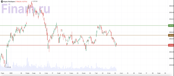 Российский фондовый рынок продолжил снижение в четверг, 25 сентября. Попытки роста по-прежнему блокирует сохраняющаяся геополитическая напряженность. После недавних жестких высказываний Дональда Трампа по ситуации на Украине выступил Генсек НАТО Марк Рютте, поддержав американскую позицию: он пообещал непрерывные поставки американского вооружения Украине и отметил, что у европейских стран нет необходимости закупать российскую нефть. При этом в ЕС все еще продолжаются споры вокруг отказа от российских энергоносителей. Во внутренней повестке — аналогичная двойственность. Глава ЦБ Эльвира Набиуллина предупредила, что слишком резкое снижение ключевой ставки может разогнать инфляционный маховик, но отметила, что проект нового бюджета носит дезинфляционный характер, несмотря на повышение НДС. При этом Банк России остается крайне осторожным при принятии решений. Тем временем заместитель председателя правительства Александр Новак прокомментировал ситуацию с топливом в стране: ожидается запрет на экспорт дизтоплива и продление запрета на экспорт бензина до конца года, что должно помочь решить проблему дефицита в ряде регионов. По итогам основной сессии Индекс МосБиржи упал на 0,76% до 2702 пунктов, а долларовый индекс РТС снизился на 0,30% до 1018 пунктов. Сильнее всего упали бумаги «Магнита» (-4,54%), ПИКа (-2,79%), «Русала» (-2,17%), «Норникеля» (-1,94%), «РусГидро» (-1,81%). В плюсе закрылись «ФосАгро» (+0,38%), «Татнефть» ап (+0,32%), МКБ (+0,21%), «Полюс» (+0,04%). Сервис «VK Видео» продемонстрировал значительный рост в первой половине 2025 года: объем показов видеорекламы увеличился на 54% (г/г), а доходы от видеорекламы на платформах VK — на 71%. По данным компании, в июле 2025 средняя месячная аудитория «VK Видео» составила 76,4 млн пользователей. Несмотря на хорошие новости, акции VK просели вслед за рынком — на 0,74%. Инвесторам, интересующимся российским рынком акций, мы по традиции рекомендуем обратить внимание на стратегию «RU. Капитал и дивиденды». Технический анализ Индекс МосБиржи С точки зрения теханализа на дневном графике Индекс МосБиржи продолжает находиться у крепкого уровня 2700. Разворот рынка и формирование растущего тренда не реализовались. Ожидаем дальнейшие движения рынка в рамках боковика 2700-2850. В случае пробоя указанного уровня возможно формирование нисходящего тренда.
