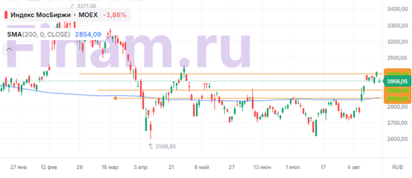 Индекс МосБиржи на дневном графике отскочил вниз от сопротивления в районе 3000 пунктов и начал консолидацию между уровней 3000 и 2900. Ближайшая сильная поддержка проходит по 2850, где сосредоточена 200-дневная скользящая средняя. Ожидается, что в ближайшие дни рынок продолжит движение в диапазоне 2900–3000 до появления новых значимых внешних драйверов.