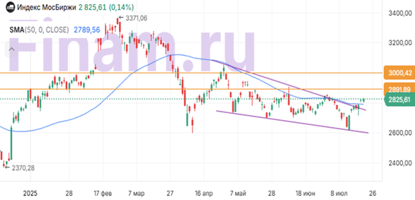 Российский фондовый рынок завершил торги в «зеленой зоне» во вторник, 22 июля, хотя сессия начиналась с коррекции после ощутимого роста в предыдущие дни. Поддержку отечественным акциям оказывали ожидания дальнейшего смягчения монетарной политики Банком России на заседании в конце текущей недели, причем на фоне все более явных признаков замедления инфляции в стране растет вероятность, что ключевая ставка будет понижена сразу на 2 п.п. — до 18% годовых. Кроме того, инвесторы следили за новостями на тему очередного раунда переговоров в Стамбуле, который может состояться до конца этого месяца. Впрочем, представители российских властей заявляют, что на прогресс рассчитывать не стоит. При этом сообщения о новых санкциях Великобритании против более чем сотни судов, входящих в так называемый «теневой флот» России, не произвели особого впечатления на участников торгов. Внешний фон для российского рынка сегодня был не самым благоприятным. На зарубежных фондовых площадках наблюдались смешанные настроения, а цены на нефть находились в ощутимом минусе. По итогам основной сессии Индекс МосБиржи увеличился на 0,14% до 2825,6 пункта, долларовый индекс РТС — на 0,44% до 1139,9 пункта. Лидерами роста стали акции «Совкомбанка» (+3,7%), ОГК-2 (+3,5%), МКБ (+2,5%), «Норникеля» (+2,1%), «ФосАгро» (+1,9%), «РуссНефти» (+1,7%), «НоваБев» (+1,5%), «Северстали» (+1,3%). В минусе сессию завершили бумаги «Селигдара» (-2,5%), «Аэрофлота» (-1,4%), НМТП (-1,3%) и Ozon (-1,2%). Акции «ИВА» (IVA Technologies), разработчика экосистемы корпоративных коммуникаций, подскочили в цене на 8,3% на новости о том, что «Фонд технологических инвестиций» приобрел 1% акций компании. Как сообщается, покупка совершена в рамках стратегического партнерства между организациями. Инвесторам, интересующимся российским рынком акций, мы по традиции рекомендуем обратить внимание на стратегию «RU. Капитал и дивиденды». Технический анализ Индекс МосБиржи На дневном графике Индекс МосБиржи вышел наверх из локального нисходящего клина, а также преодолел 50-дневную скользящую среднюю. Ожидаем продолжения подъема до сопротивления 2890 пунктов, а при его прохождении — далее в район 3000 пунктов.