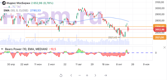 Российский рынок акций в среду, 22 октября, продемонстрировал уверенный коррекционный рост после волатильного снижения накануне. Индекс МосБиржи к вечеру закрепился выше 2652 пунктов, поднявшись на 0,8%. Основную поддержку рынку обеспечили дорожающая нефть (Brent выше $62,5 за баррель) и оживление в бумагах крупных энергетических и сырьевых компаний — инвесторы отыгрывали позитивные сигналы из Минэнерго, соседних рынков и свежих корпоративных новостей. Общий фон для инвесторов остался умеренно-оптимистичным: геополитические риски и ожидания новых санкций со стороны ЕС сохраняются, однако надежды на мирное урегулирование конфликта вокруг Украины и планы по встрече президентов США и России продолжают поддерживать умеренный спрос на российские активы. В то же время новостной поток о возможной отмене или переносе саммита Трампа и Путина пока ограничивает масштаб покупок, так же, как и ожидания итогов заседания Банка России по ставке в пятницу и публикации новых данных по инфляции. Поддержку рынку оказывал рост нефтяных цен: Brent выросла до $62,8 за баррель, прибавив 2,5%, что традиционно позитивно для акций нефтегазовых компаний. Однако эта поддержка носила ограниченный характер, поскольку завершившийся сезон корпоративной отчетности прошел без впечатляющих инвесторов результатов, а публикация отдельных слабых результатов, как у «Роснефти», охлаждала аппетит к покупке отдельных бумаг. Технический анализ Индекс МосБиржи Индекс МосБиржи остается ниже важного сопротивления в районе 2700 пунктов, но динамика последних сессий говорит о высоком спросе на коррекционные идеи и желание инвесторов использовать откаты для выгодных точечных покупок.