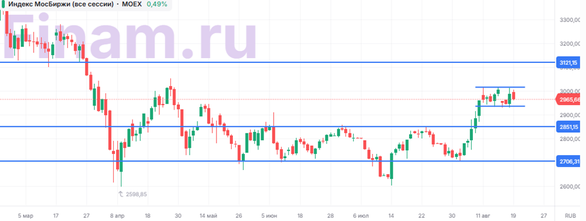 Во вторник, 19 августа, Индекс МосБиржи закрылся в плюсе. При этом основной рост пришелся на вчерашнюю вечернюю сессию, а в течение дня индекс постепенно корректировался. Участники рынка умеренно позитивно восприняли итоги переговоров Трампа и Зеленского. Вероятно, инвесторов обрадовали достаточно положительные комментарии с обеих сторон и наметившиеся перспективы трехсторонней встречи с участием и президента РФ. В то же время хотя некоторый прогресс в переговорах и наблюдается, но противоречий остается еще достаточно много, из-за чего нервозность на рынках сохраняется.
