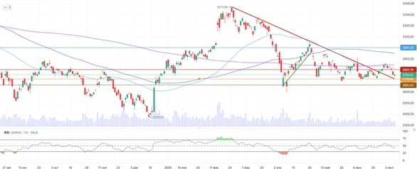Во вторник, 8 июля, российский фондовый рынок завершил торги небольшим снижением. Индекс МосБиржи опустился на 0,04%, до 2755,12 пункта. Центробанк РФ установил официальный курс доллара на уровне 78,17 руб. (-0,7%), евро — 91,97 руб. (-0,5%). Цена на нефть марки Brent выросла на 0,50%, до $69,93 за баррель. Рынок по-прежнему не находит весомых поводов для роста. Давление на котировки оказывает крепкий рубль и заморозка переговорного процесса по украинскому конфликту. Поддержкой выступает умеренное восстановление цен на нефть, однако участники рынка, судя по всему, не считают этот рост долгосрочным. Хуже рынка выглядели акции российских нефтяных компаний: «Татнефти» (-2,4%), «Роснефти» (-1,6%), «Лукойла» (-0,8%) и «Сургутнефтегаза» (-0,7%). Снижение котировок связано с негативным влиянием крепкого рубля на бизнес экспортеров. Совет директоров «Газпрома» утвердил программу развития на 2026–2035 годы, сосредоточив внимание на росте поставок газа на внутренний рынок и диверсификации импорта. Акции компании подешевели на 0,2%. «АЛРОСА» запустила работы на алмазной трубке «Карпинского-2». По данным компании, общие запасы трубки превышают 40 млн тонн алмазосодержащей руды. Бумаги «АЛРОСы» выросли на 0,4%. «НоваБев Групп» опубликовала операционный отчет за первое полугодие 2025 года: общие отгрузки компании выросли на 5% (г/г), при этом отгрузки собственной продукции увеличились на 6% (г/г). Инвесторам, интересующимся российским рынком акций, мы по традиции рекомендуем обратить внимание на стратегию «RU. Капитал и дивиденды». Технический анализ Индекс МосБиржи Российский бенчмарк продолжает коррекционное движение. Ближайшим уровнем поддержки выступает отметка 2720 пунктов, от которой сохраняется вероятность краткосрочного отскока Индекса МосБиржи.