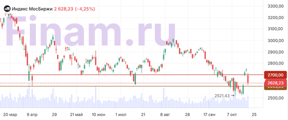 Российский фондовый рынок во вторник, 21 октября, продолжил дневное падение на фоне совокупности внешнеполитических и санкционных рисков. Министр иностранных дел Сергей Лавров заявил, что конкретные сроки возможной встречи президентов России и США пока не определены, подготовка продолжается на уровне внешнеполитических ведомств, что усиливает неопределенность. Дополнительное давление оказывают сообщения о готовности Словакии поддержать 19-й пакет санкций ЕС при выполнении ее условий, а также заявления польских властей, отражающие сохраняющееся напряжение в отношениях. Инвесторы также осторожничают в ожидании решения Банка России по ключевой ставке на предстоящем заседании. К концу торгов давление на рынок усилилось после заявления официального представителя Белого дома о том, что в ближайшем будущем встреча президентов Трампа и Путина не планируется. По словам высокопоставленного представителя администрации США, госсекретарь Рубио и министр иностранных дел России Сергей Лавров провели продуктивный разговор, однако конкретных планов на саммит нет, что усилило негативные настроения и спровоцировало дальнейшее снижение Индекса МосБиржи. По итогам сессии Индекс МосБиржи снизился на 4,22% и составил 2628,2 пункта, а долларовый индекс РТС упал 4,2%, достигнув уровня 1018,1 пункта. Лидерами падения на российском рынке 21 октября стали акции «Юнипро» (-8,89%), «СПБ Биржи» (-8,70%), ПИК (-8,16%), «ЭН+ Груп» (-6,60%), «iВУШ Холдинг» (-6,38%), «Сегежи» (-6,38%), «Полюса» (-6,30%), «Аэрофлота» (-5,95%), «Самолета» (-5,95%) и «Газпрома» (-5,66%). В зеленой зоне завершили сессию лишь бумаги Ozon Holdings, прибавившие 0,56%. Дом.РФ утвердила дивидендную политику, выплаты акционерам составят 50% от чистой прибыли. «ФосАгро» ожидает в 2026 г. инвестпрограмму на уровне 70-75 млрд руб., сопоставимом с показателями 2024–2025 гг., планирует выпуск более 12 млн тонн удобрений против 12,5 млн тонн в 2025 г. и видит потенциал дальнейшего роста. ФАС предложила с 1 января 2026 г. повысить тарифы на транспортировку нефти услугами «Транснефти» в среднем на 5,1%. Инвесторам, интересующимся российским рынком акций, мы по традиции рекомендуем обратить внимание на стратегию «RU. Капитал и дивиденды». Технический анализ Индекс МосБиржи Индекс Московской биржи продолжает снижение в ходе вечерней сессии и удерживается в районе 2628,2 пункта. В случае дальнейшего падения не исключается его движение к отметке 2600 пунктов.