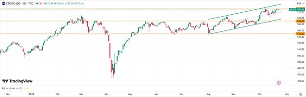 Euro STOXX 600 Индекс Stoxx 600 колеблется вблизи 573,5 пункта, двигаясь в восходящем среднесрочном тренде, консолидируясь у уровня сопротивления 574,5 пункта.