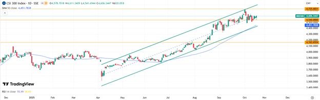 CSI 300 Индекс CSI 300 на дневном графике отскочил вверх, оттолкнувшись от уровня 4540 пунктов. На дневном графике сохраняется восходящий канал, техническая картина благоприятствует продолжению импульса в сторону 4700–4750. В случае пробоя 4540, поддержку индексу может оказать 50-дневная скользящая средняя, которая проходит вблизи нижней границы канала, на уровне 4451.