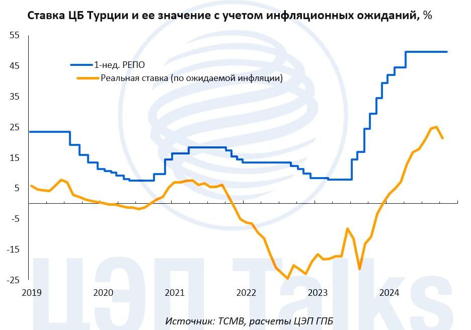 На фоне последних решений ЦБ РФ и ожиданий рынком дальнейшего повышения ключевой ставки возникают предположения, что в России возможен «турецкий сценарий» со ставкой в 50%. Это кажется не совсем вероятным, т.к. от турецкого ЦБ изначально требовались более высокие ставки: - Повышение ставки в Турции началось, когда инфляция достигла уровня 40% г/г и держалась на «схожем» уровне (40-80%) на протяжении полутора лет. В РФ, напротив, сразу после инфляции в 12% (в годовом выражении) в июле 2023 г. была соразмерно повышена ключевая ставка. - Ставка в Турции влияет только на часть активности в банковском секторе, поскольку в местных банках высока доля валютных активов (30%) и пассивов (60%). Это ограничивает эффект от повышений ставки, т.к. существует альтернатива в виде валютного кредитования/сбережений. В РФ обратная тенденция - девалютизации банковских балансов. Что из «турецкого сценария» может быть применено в российской экономике? Активная макропруденциальная политика, дополняющая монетарную в борьбе с инфляцией. Среди ее инструментов, используемых в Турции: - Лимиты по росту розничного (применяется в РФ, но в иной форме) и корпоративного кредитного портфеля (не применяется, но первые изменения анонсированы) и их регулярный пересмотр. - Повышение нормативов обязательного резервирования по депозитам.