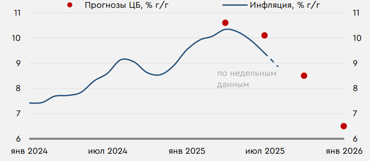 Мировой рынок в среду перешел к росту. Инвесторы отыгрывали не только выходящую отчетность компаний, но и анонсированные планы отдельных фирм по масштабным инвестициям в США. Рынок РФ на основной торговой сессии снизился. Давление на активы в моменте оказывали новости о введении США дополнительных 25% пошлин на Индию за покупку российской нефти. Впрочем, на вечерней сессии рынок РФ резко пошел вверх на заявлениях президента США о планируемой скорой встрече с главой России. Поддержку активам также могли оказывать данные от Росстата, показавшие снижение цен в РФ за неделю сразу на 0,13% после 0,05% н/н неделей ранее. В этих условиях резюме заседания ЦБ РФ вчера мало повлияло на краткосрочную динамику рынка. Сегодня инвесторы в мире будут отыгрывать утренние данные из Китая, указавшие на сокращение торгового профицита КНР в июле на фоне неожиданного роста импорта на 4,1% г/г (прогноз -1,0% г/г). В дальнейшем на рисковые активы могут повлиять июльские данные по инфляционным ожиданиям от ФРБ Нью-Йорка. Рынок РФ сегодня продолжит отыгрывать геополитические новости, а вечером оперативные сигналы о состоянии экономики может дать июльский мониторинг отраслевых финансовых потоков от Банка России. Нефть и рубль Вчера нефтяные цены продолжили идти вниз. Вечерние новости снизили в глазах инвесторов риски значимых перебоев в поставках РФ, что оказало давление на котировки. С другой стороны, недельные данные от Минэнерго США вчера указали на неожиданно сильное снижение запасов и нефти, и бензина. Сегодня фьючерсы Brent торгуются у $67,4/барр. В условиях ослабившихся опасений относительно предложения нефти со стороны России котировкам пока может быть сложно вернуться сильно выше $68/барр. Рубль в среду вновь не показывал ярко выраженную динамику. Сегодня, впрочем, на усилившихся надеждах на скорую деэскалацию курс CNYRUB снизился к 11,01 руб./юань. Другие курсы валют EM с утра двигаются разнонаправленно. В целом на геополитическом позитиве курс на время может уходить ниже 11 руб./юань. Резюме заседания Банка России В вышедшем вчера резюме июльского заседания ЦБ традиционно наибольшее внимание уделяется аргументам Совета директоров в пользу различных сценариев изменения ставки. Среди аргументов за снижение «ключа» лишь на 100 б.п. было отсутствие уверенности в дальнейшем уменьшении инфляционных ожиданий, а также риски со стороны бюджетной политики. В пользу же снижения ставки на 200 б.п. выступала в первую очередь необходимость коррекции денежнокредитных условий, которые в реальном выражении стали сверхжесткими на фоне неожиданно сильного замедления инфляции. Помимо этого, Банк России вчера опубликовал квартальные ориентиры по своим прогнозам. Так, на конец сентября ЦБ прогнозирует инфляцию вблизи 8,5% г/г, но по вчерашним недельным данным рост цен уже замедлился до 8,8% г/г. На этом фоне повторное снижение ставки на 200 б.п. в сентябре выглядит все более вероятным. Поквартальные прогнозы по инфляции Банка России и фактическая инфляция в РФ