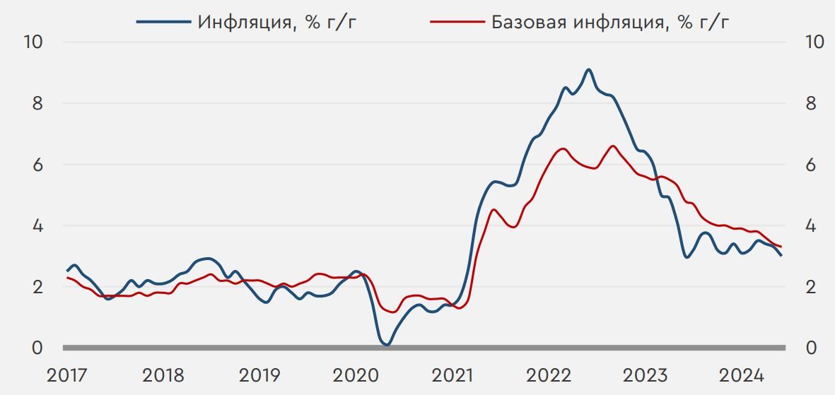 На глобальном рынке в четверг наблюдалась разнонаправленная динамика. Вчера июньские данные из США указали на первое с мая 2020 года помесячное снижение потребительских цен (см. развернутый комментарий). В результате в ожидании более раннего снижения ставки ФРС доходности американских казначейских бумаг падали, а доллар слабел. Одновременно, впрочем, вчерашняя статистика напомнила о рисках рецессии, что оказывало давление на фондовый рынок. В России вчерашний день отметился лишь активным коррекционным ростом рынка акций после дивидендных отсечек. Сегодня инвесторы в мире будут отыгрывать утренние данные по внешней торговле КНР. В июне рост экспорта страны ускорился сильнее, чем ожидалось, но импорт Китая упал на 2,3% г/г (прогноз 2,8% г/г), что указывает на серьезные проблемы со спросом внутри страны. Внимание рынок также обратит на июльский индекс потребительских настроений Мичиганского Университета и на данные по ценам производителей США за июнь, которые дадут дополнительные сигналы о характере ценового давления в стране. Локально в РФ на сегодня не запланировано принципиально важных для инвесторов событий. Нефть и рубль Нефтяные цены вчера смогли вырасти. Поддержку котировкам оказало заметное ослабление доллара после выхода данных по инфляции в США. Тем не менее вернувшиеся опасения рецессии ограничивали темпы роста нефтяных цен. МЭА в своем месячном отчете вчера незначительно понизило свои прогнозы по росту спроса на нефть в текущем году, но отметило слабую экономическую ситуацию в КНР. Сегодня фьючерсы Brent торгуются у $85,9/барр. Тем не менее на фоне сегодняшних неожиданно слабых данных по импорту Китая риски возврата котировок на уровни ниже $85/барр. сохраняются. В четверг рубль незначительно укрепился. Важных локальных факторов для курса пока нет, номинальную поддержку рублю может оказывать глобальное ослабление доллара. Сегодня курс CNYRUB находится у 11,96 руб./юань. Другие курсы валют EM с утра двигаются разнонаправленно. В ближайшие дни и предложение валюты, и спрос на нее могут остаться слабыми, и курс, вероятно, задержится вблизи 11,9-12,1 руб./юань. Ценовая статистика в США Вчерашние данные показали, что в июне цены в США снизились на 0,1% м/м (прогноз +0,1% м/м), а в годовом выражении инфляция замедлилась с 3,3% г/г до 3,0% г/г (прогноз 3,1% г/г), обновив минимум за год. Такую динамику ИПЦ показывал на фоне продолжившегося снижения цен на энергию темпами в 2% м/м. Тем не менее темпы роста базового показателя (исключающего цены на энергию и другие волатильные компоненты) также были ниже ожиданий рынка – его рост замедлился с 3,4% г/г до 3,3% г/г (прогноз 3,4% г/г). Происходило это на фоне снижения цен на подержанные авто сразу на 1,5% м/м и замедлившегося удорожания аренды с 0,4% м/м до 0,2% м/м, до минимальных с августа 2021 года темпов. В результате после вчерашних данных фьючерсный рынок практически полностью заложил снижение ставки ФРС уже на сентябрьском заседании. Инфляция и базовая инфляция в США