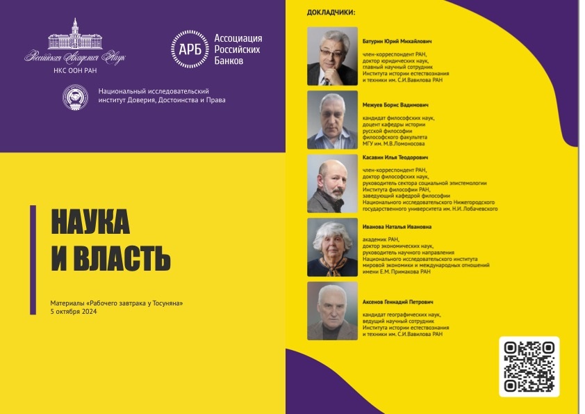 Вышел из печати сборник «НАУКА И ВЛАСТЬ». Издание составлено на основе материалов совместного заседания Научно-консультативного совета (НКС) по правовым, психологическим и социально-экономическим проблемам общества ООН РАН и Национального исследовательского института доверия, достоинства и права от 5 октября 2024 года. В сборнике под общей редакцией президента Ассоциации российских банков, академика РАН Гарегина Тосуняна представлены доклады Юрия Батурина, члена-корреспондента РАН, доктора юридических наук, главного научного сотрудника Института истории естествознания и техники им. С.И.Вавилова РАН; Бориса Межуева, кандидата философских наук, доцента кафедры истории русской философии философского факультета МГУ им. М.В.Ломоносова; Ильи Касавина, члена-корреспондента РАН, доктора философских наук,руководителя сектора социальной эпистемологии Института философии РАН, заведующего кафедрой философии Национального исследовательского Нижегородского государственного университета им. Н.И. Лобачевского; Натальи Ивановой, академика РАН, доктора экономических наук, руководителя научного направления Национального исследовательского института мировой экономики и международных отношений имени Е.М. Примакова РАН; Геннадия Аксенова, кандидата географических наук, ведущего научного сотрудника Института истории естествознания и техники им. С.И.Вавилова РАН. В сборнике рассматривается, как складываются отношения российской науки и власти, обсуждается вопрос о степени ответственности ученых и политиков за развитие экономики, производства, технологий, за качество жизни общества в целом. Ученые рассуждают о том, как достижения науки могут использоваться властными структурами, фокусируют внимание аудитории на проблемах, с которыми сталкивается российская наука, на том, что необходимо предпринять для преодоления кризиса доверия к современной науке и выстраивания плодотворных отношений на благо российского общества.