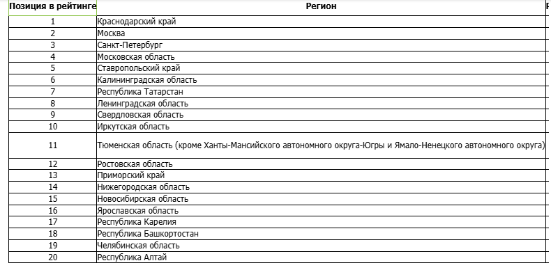 Банк ДОМ.РФ выяснил, как гостиницы в разных регионах России принимали туристов за последние 5 лет. По итогам исследования был составлен рейтинг самых гостеприимных регионов страны. Для анализа использовалось 16 критериев и динамика оценки по ним за последние 5 лет. Среди основных: количество россиян, воспользовавшихся услугами отелей в регионе, количество гостиниц, загрузка номерного фонда, продолжительность проживания туристов в гостинице. Во внимание также принимались экономические показатели, в частности, доходы от размещения туристов, принадлежность к федеральной программе «Пять морей и озеро Байкал». Итоговый рейтинг был сформирован из 20 регионов с наибольшим количеством баллов. Тройку лидеров составили Краснодарский край, Москва и Санкт-Петербург. Далее места распределились следующим образом: