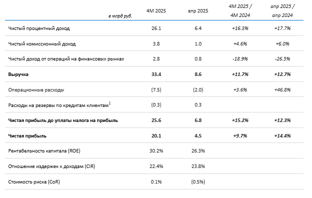 - Чистый процентный доход составил 26.1 млрд рублей (+16.3% по сравнению с результатом за 4M 2024 года); в том числе 6.4 млрд рублей за Апрель 2025 (+17.7% по сравнению с результатом за Апрель 2025). ─ Чистый комиссионный доход составил 3.8 млрд рублей (+4.6% по сравнению с результатом за 4M 2024 года); в том числе 1.0 млрд рублей за Апрель 2025 (+6.0% по сравнению с результатом за Апрель 2024). ─ Выручка составила 33.4 млрд рублей (+11.7% по сравнению с результатом за 4M 2024 года); в том числе 8.6 млрд рублей за Апрель 2025 (+12.7% по сравнению с результатом за Апрель 2024). ─ Операционные расходы за 4M 2025 составили 7.5 млрд рублей (+3.6% по сравнению с результатом за 4M 2024 года). Показатель Отношение издержек к доходам (CIR) за 4M 2025 составил 22.4%. ─ Расходы на резервы по кредитам[i] за 4M 2025 составили 0.3 млрд рублей. Показатель Стоимость риска (CoR) за 4M 2025 составил 0.1%. ─ Принимая во внимание особенности учета налога на прибыль, при анализе финансовых результатов по РСБУ следует ориентироваться на динамику показателя «Чистая прибыль до уплаты налога на прибыль». Чистая прибыль до уплаты налога на прибыль за 4M 2025 составила 25.6 млрд рублей (+15.2% по сравнению с результатом за 4M 2024 года); в том числе 6.8 млрд рублей за Апрель 2025 (+12.3% по сравнению с результатом за Апрель 2024). Чистая прибыль за 4M 2025 составила 20.1 млрд рублей (+9.7% по сравнению с результатом за 4M 2024 года); в том числе 4.5 млрд рублей за Апрель 2025 (+14.4% по сравнению с результатом за Апрель 2024). Рентабельность капитала (ROE) за 4M 2025 составила 30.2%.